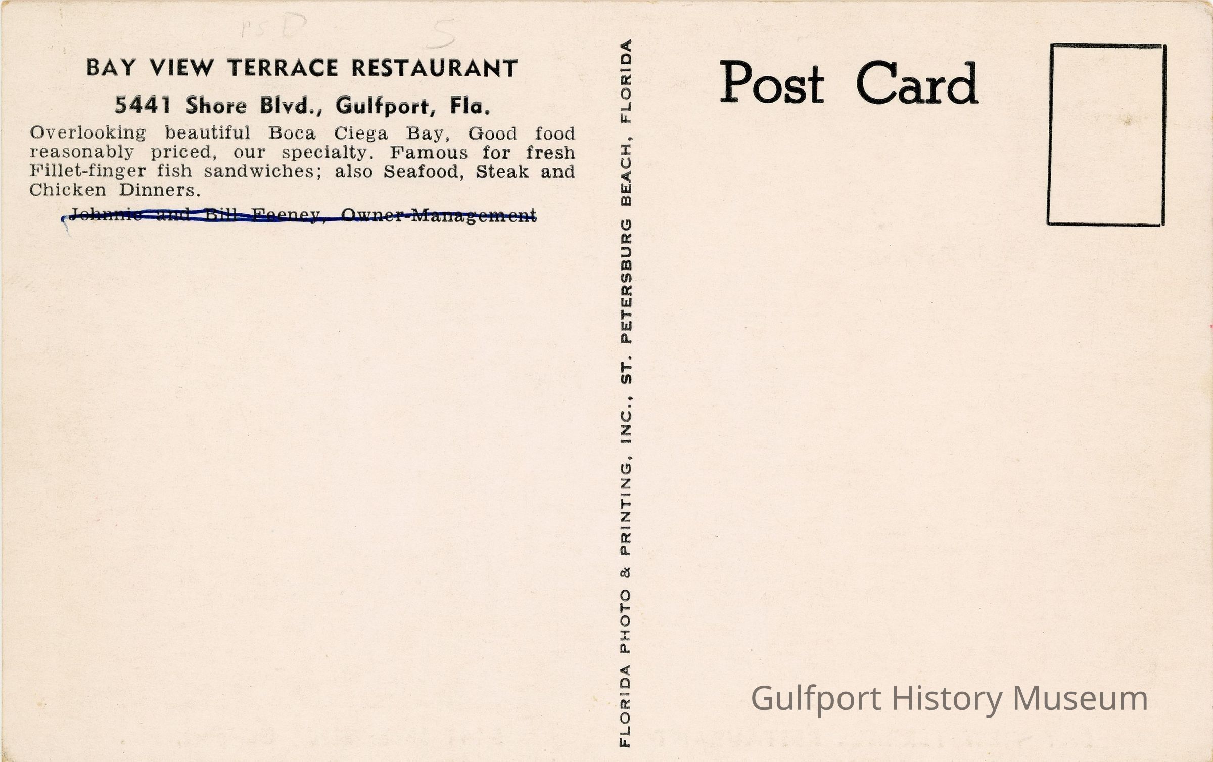 "BAY VIEW TERRACE RESTAURANT 5441 Shore Blvd., Gulfport, Fla."Subject