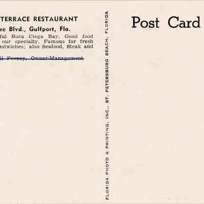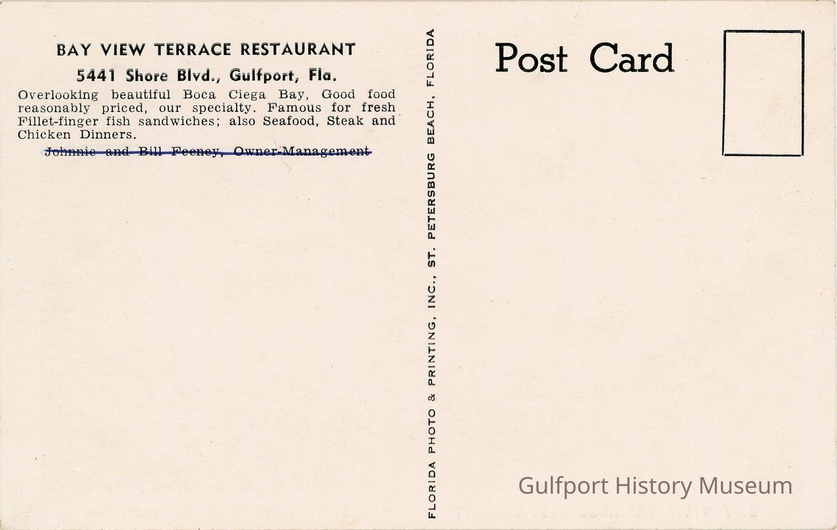 "BAY VIEW TERRACE RESTAURANT 5441 Shore Blvd., Gulfport, Fla."Subject
