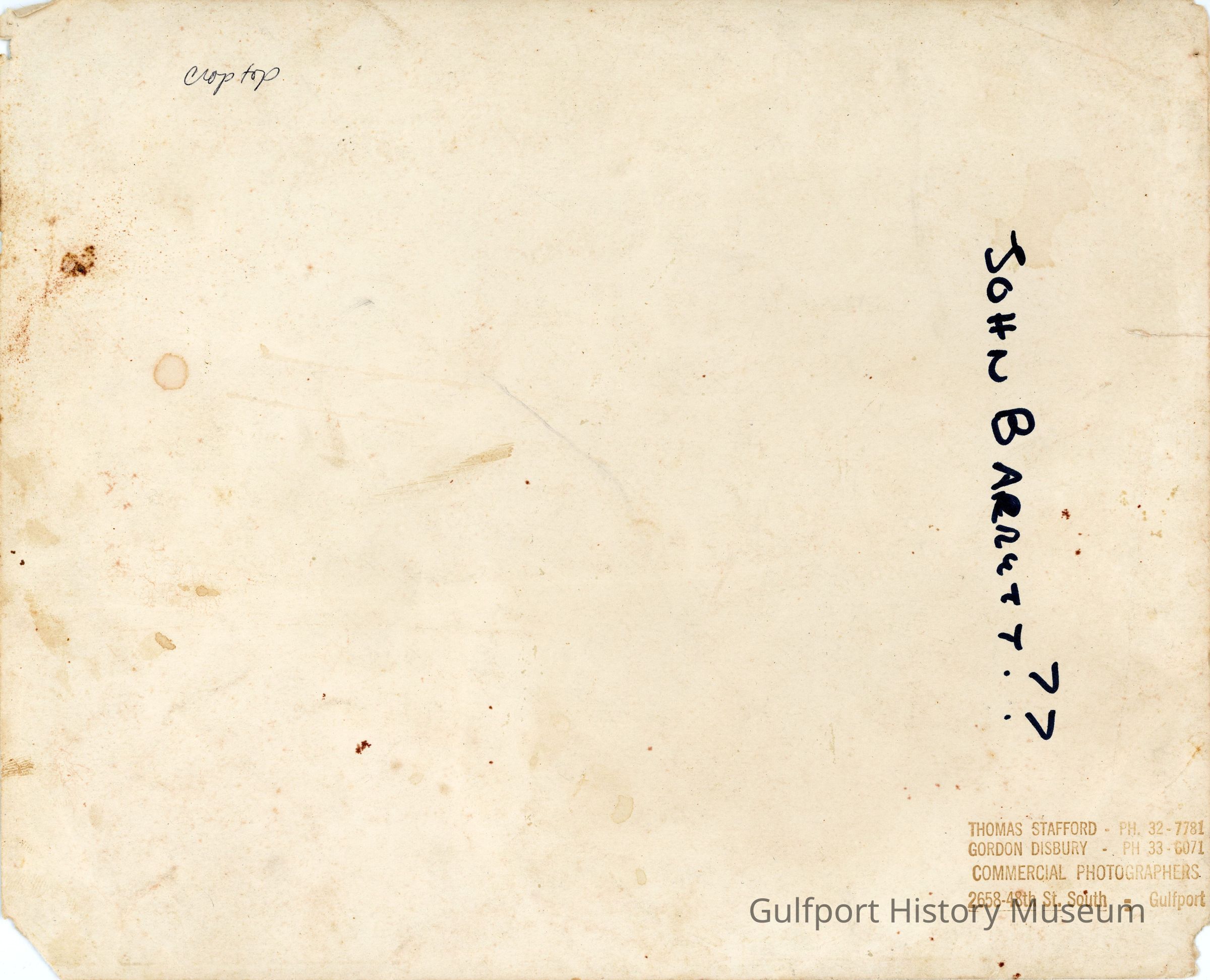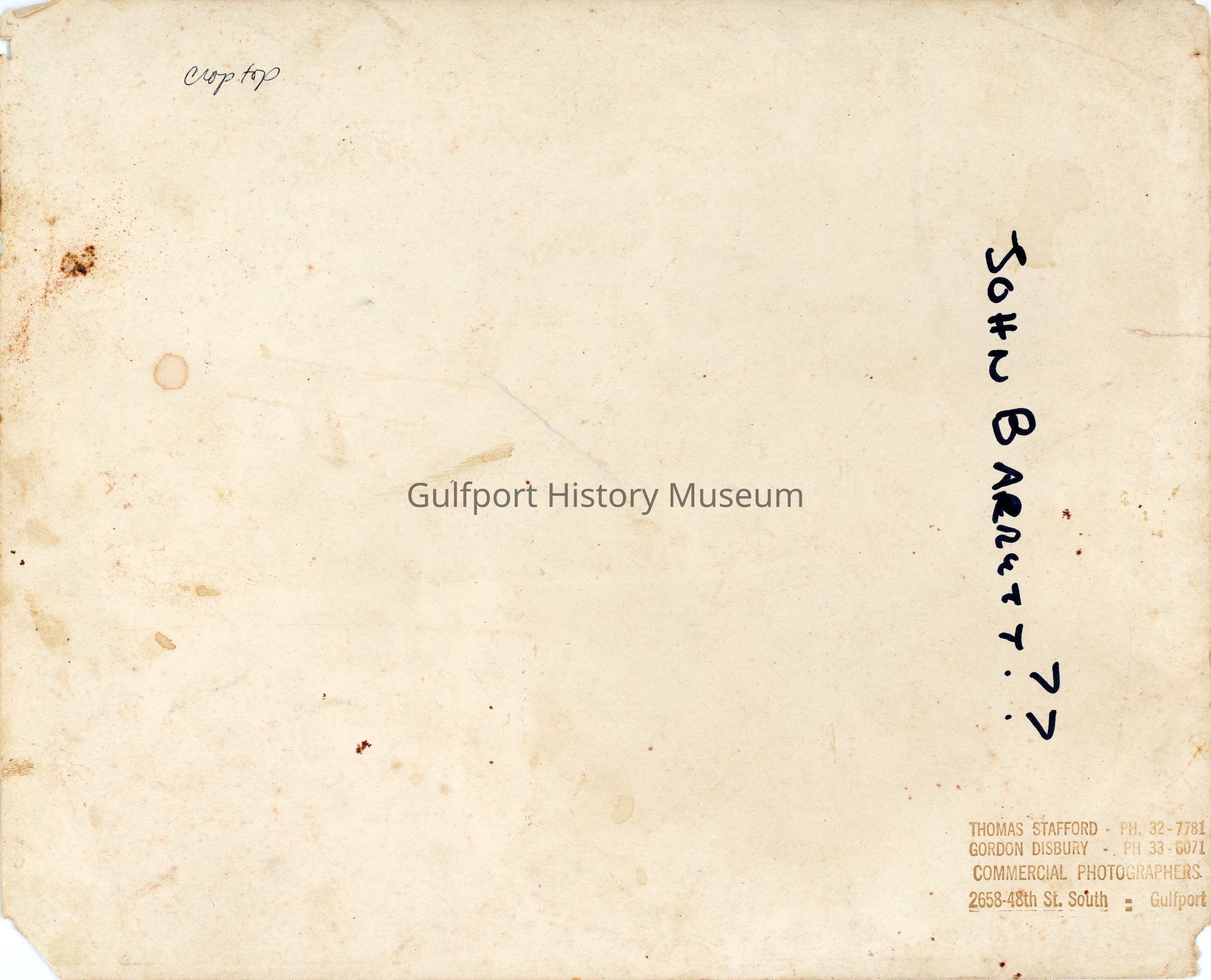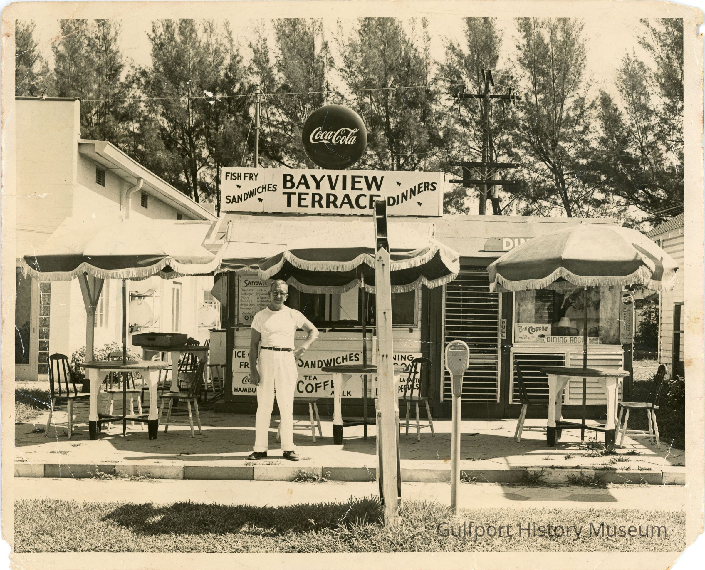 A black and white photograph of the Bayview Terrace Restaurant at 5441 Shore Blvd S. [John Barrett] is standing on the restaurant's patio. The stand has a sign on top which has a large Coca-Cola cap sign, as well as a Bayview Terrace sign which reads, "FISH FRY * SANDWICHES * BAYVIEW TERRACE * DINNERS *." There are a few tables on the patio, three of which have large umbrellas. The building itself has a service window, counter, and a small indoor dining room.Photograph Details