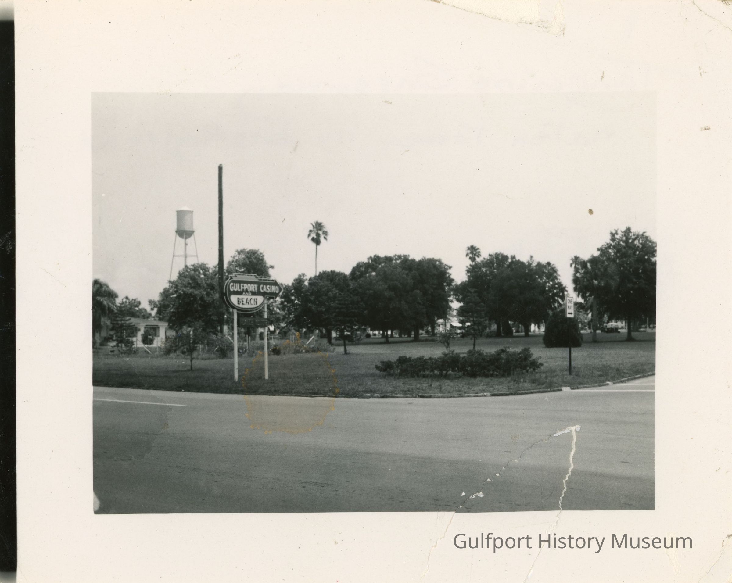 A black and white photograph of Beach Blvd S at 22nd Ave S. A sign in the shape of an arrow which reads "GULFPORT CASINO AND BEACH" points south down Beach Blvd. The water tower at the City Hall complex is visible in the background. Houses line the street.