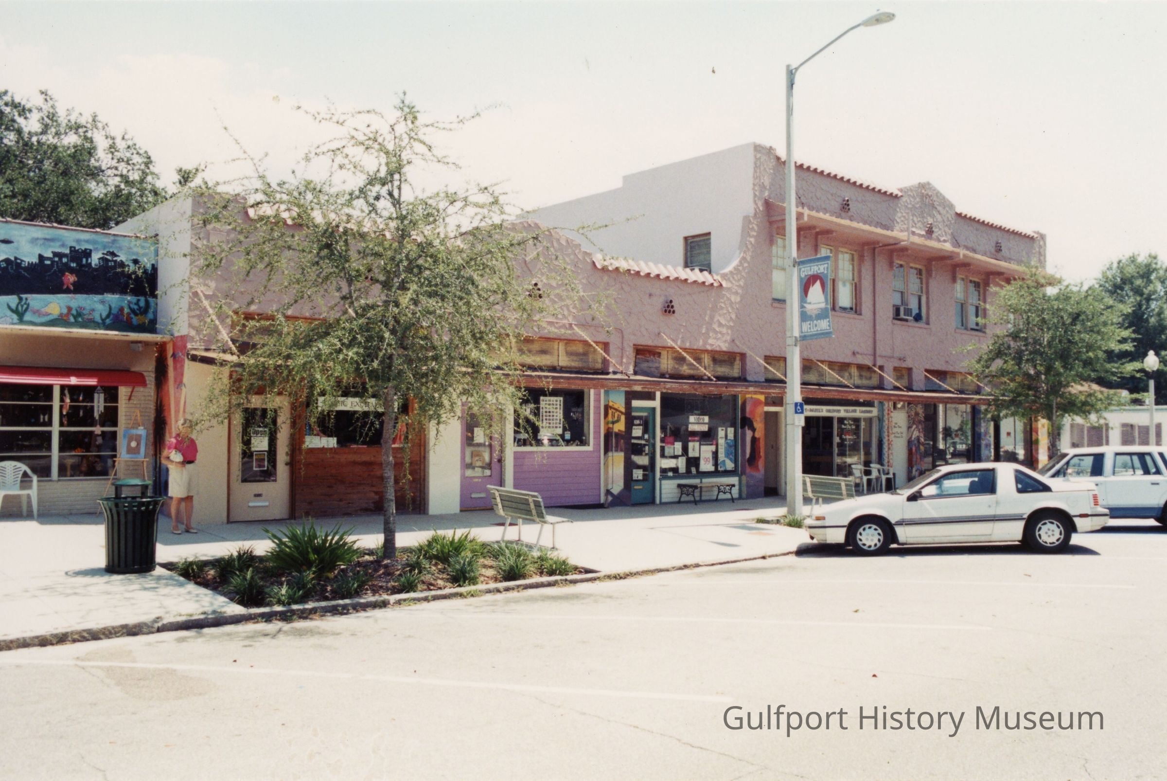 A color photograph of businesses [Art Village] on the east side of the 2800 block on Beach Blvd, including Key West Style, Top This Boutique, and Fabric Exchange. Cars are parked diagonally in the street. Art lines the sidewalk and a banner which reads, "GULFPORT WELCOME" hangs from a streetlight.