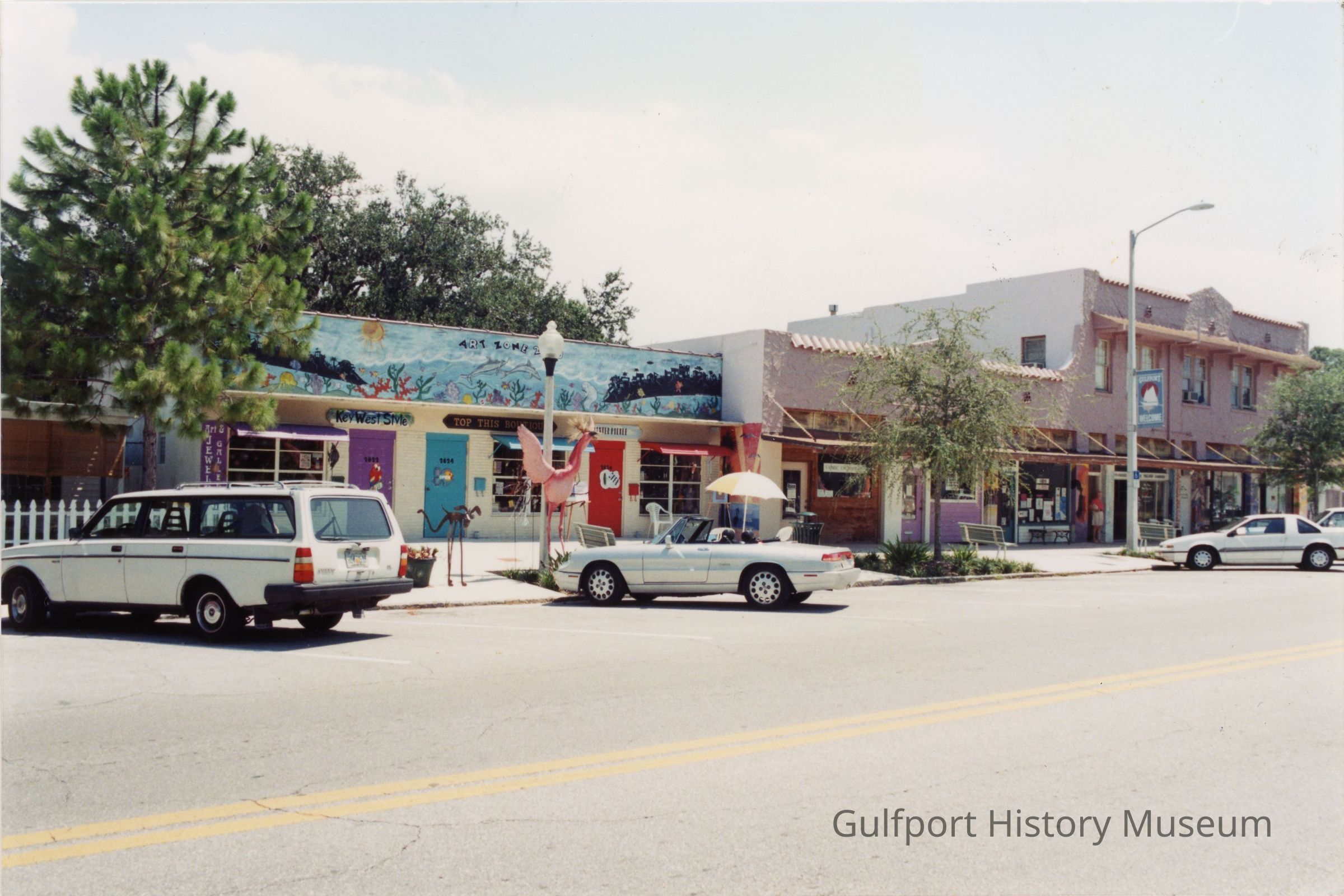 A color photograph of businesses [Art Village] on the east side of the 2800 block on Beach Blvd, including Key West Style, Top This Boutique, and Fabric Exchange. Four cars are parked diagonally in the street. Art lines the sidewalk and a banner which reads, "GULFPORT WELCOME" hangs from a streetlight.