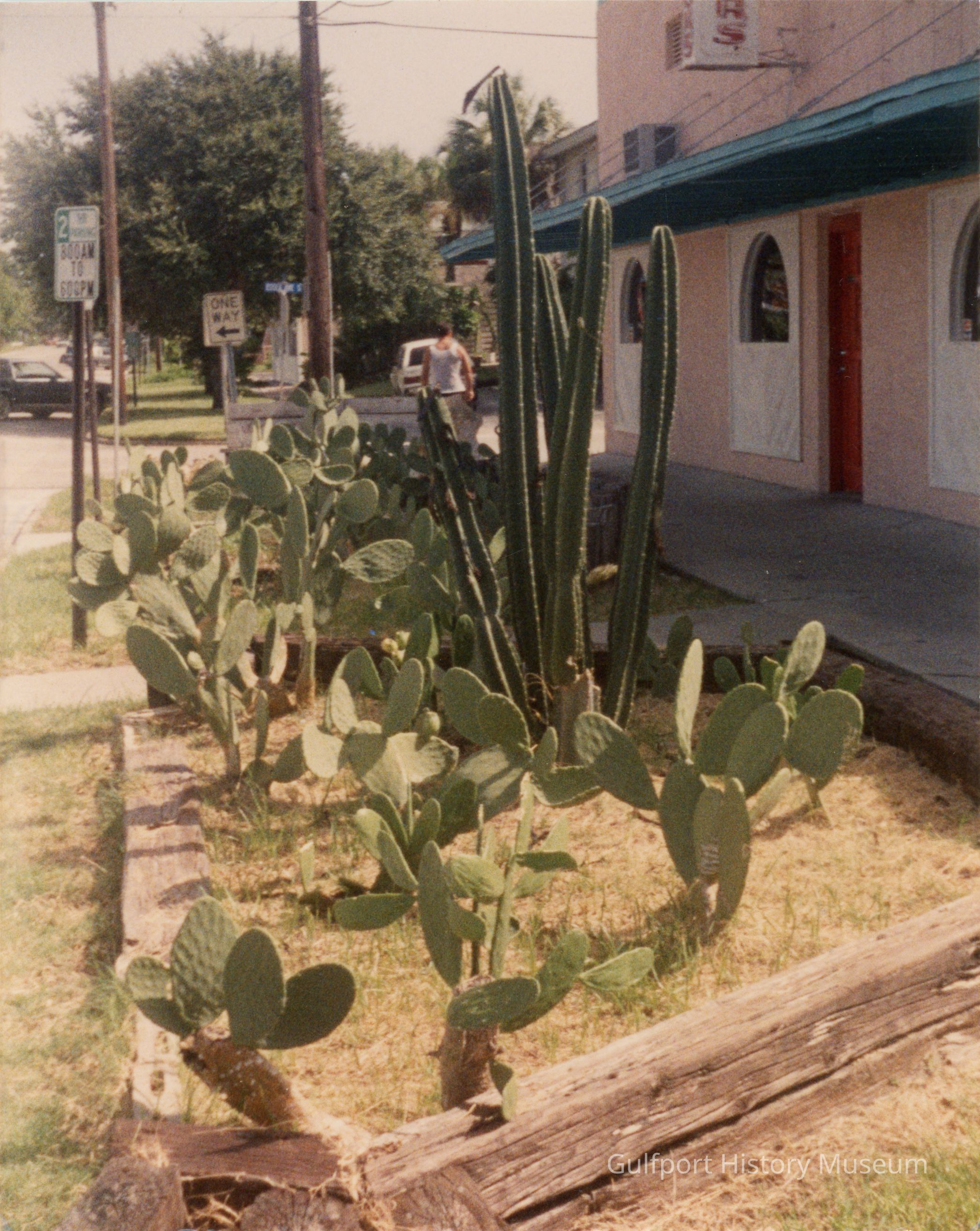 A color photograph of various cacti planted on an easement in front of a salmon-colored building on Beach Blvd. The building has a blue awning, red door, and half circle windows. There is a man walking down the sidewalk away from camera.
