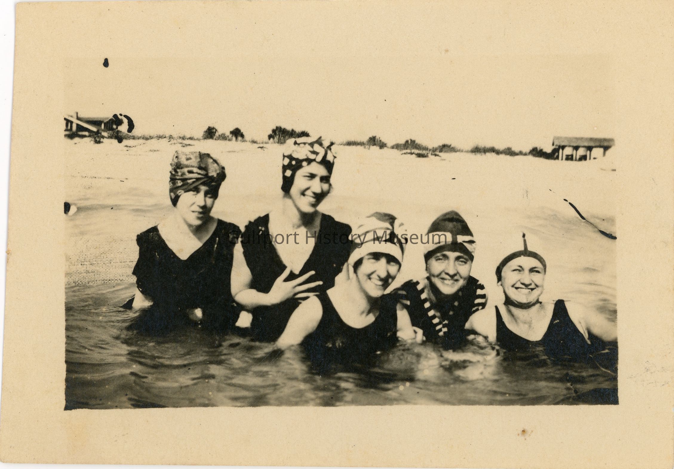 A black and white photograph of five women in the water at the beach in swim caps and dark swimsuits. A sand beach with two buildings on either side of the frame can be seen in the background.