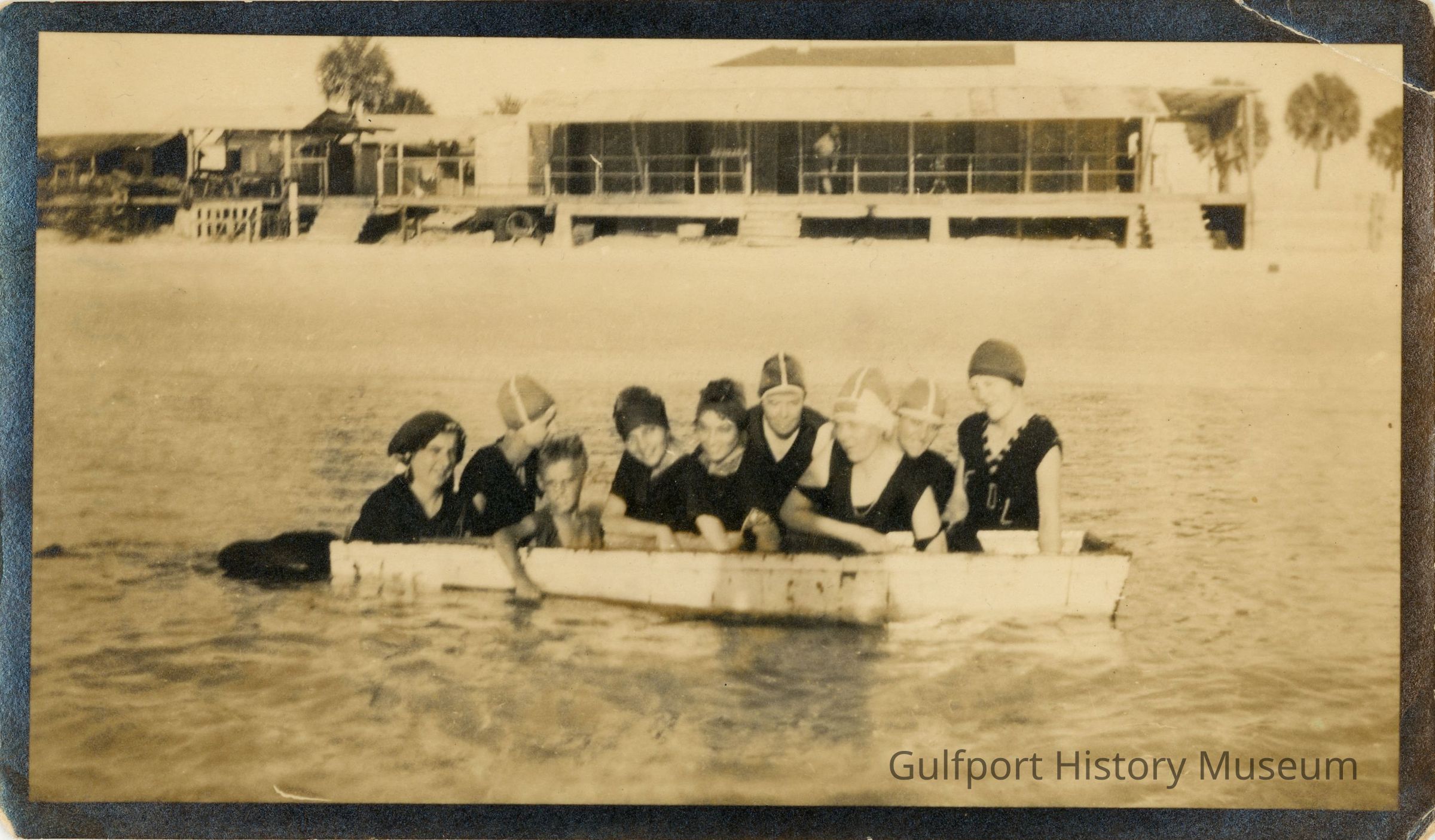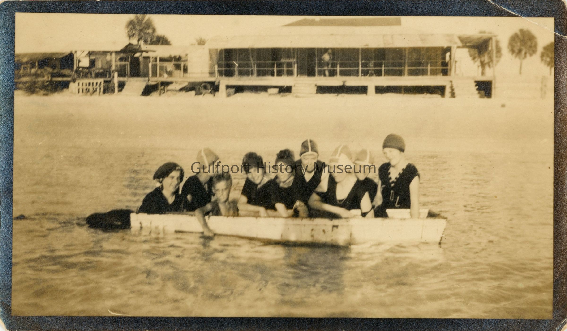 A black and white photograph of eight woman and a boy. The women are standing in the water wearing swimsuits and swim caps and holding onto a small boat, in which the boy is sitting. A building and several palm trees are in the background on the shore.