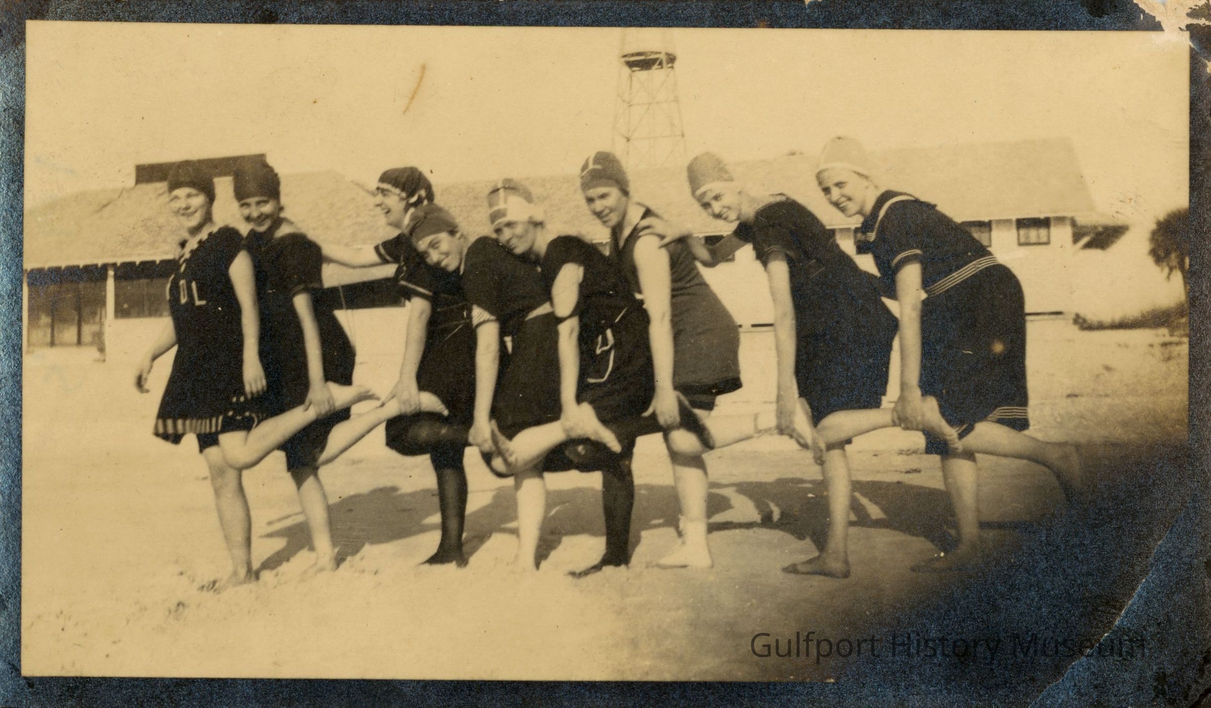 A black and white photograph of eight women in swimsuits and swim caps doing the same pose standing in a line. Barefoot on the sand, each woman is bending their left knee and holding the ankle of the woman in front of her. A building and a water tower are visible in the background.