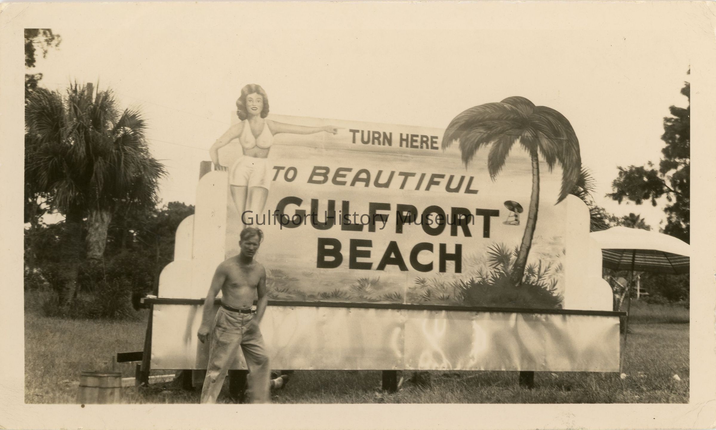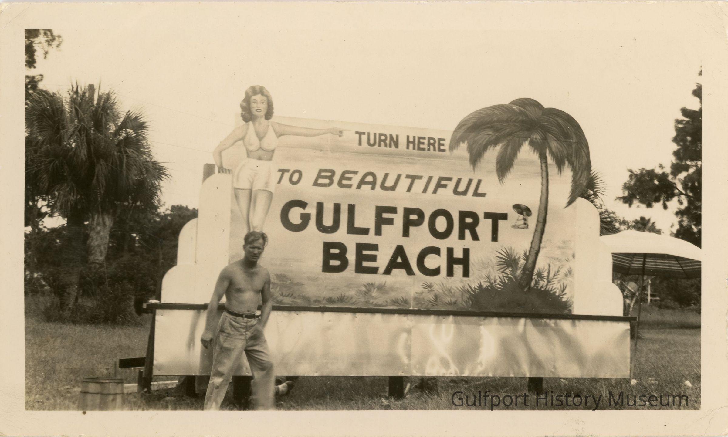 A black and white photograph of a large sign which reads "TURN HERE TO BEAUTIFUL GULFPORT BEACH." The sign features a woman in a two piece, white swimsuit and heels on the left and a palm tree with a woman under a beach umbrella on the sand in the distance on the right. There is a shirtless man standing in front of the sign posing for the photo. There is an umbrella open behind the sign.
