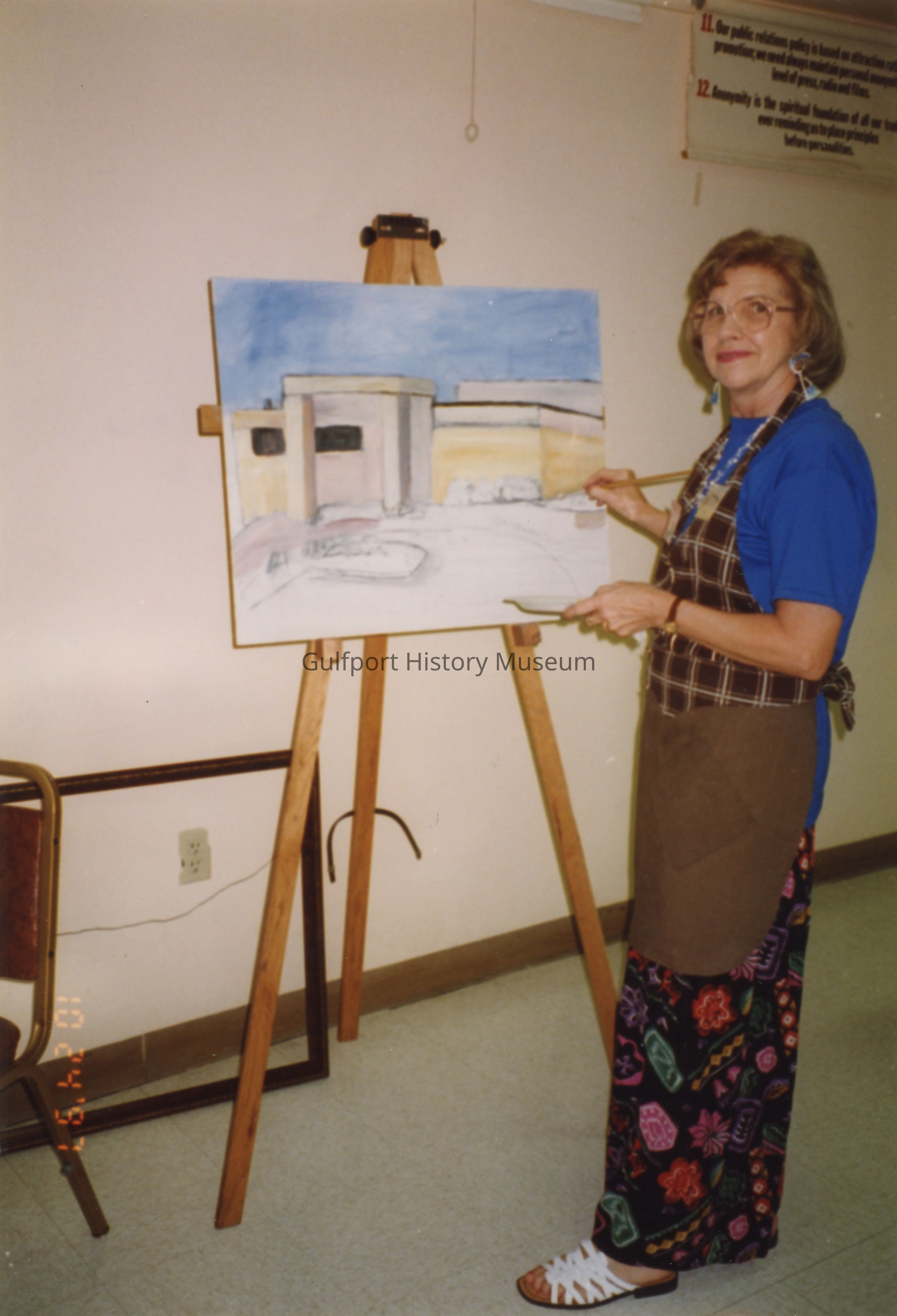 A color photograph of Betty Staebell working on a painting of the Gulfport Multipurpose Senior Center.