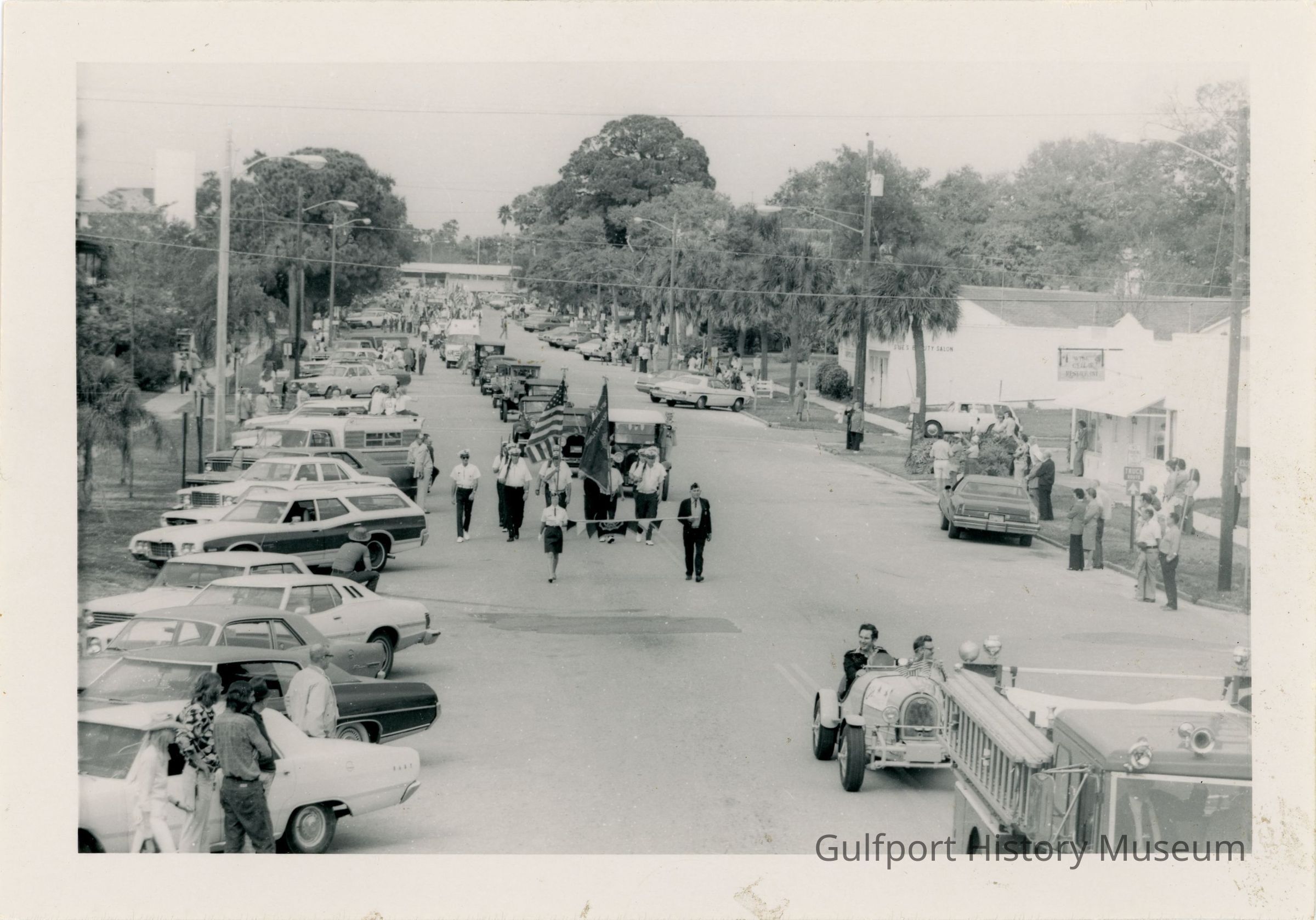 A black and white photograph of the Bicentennial Citizens Parade going south down Beach Blvd as part of the bicentennial celebrations in Gulfport. A fire truck is leading the procession seen in frame. George Larrison and City Manager Harry Perkins follow in a 1927 Bugatti. Two people hold a banner in front of the Gulfport American Legion Post 125.