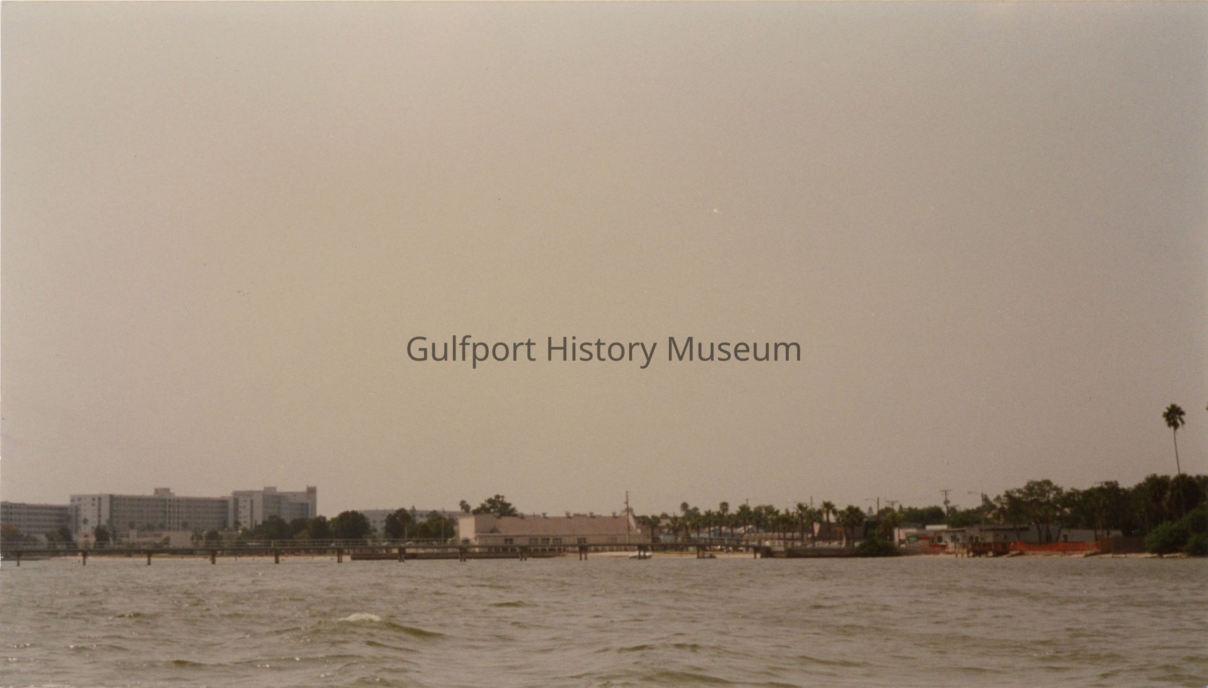 A color photograph of Gulfport Beach from Boca Ciega Bay. The Gulfport Casino, Gulfport Recreation Center, and Town Shores can be seen in the background. The sky is dark and grey and it appears to be windy.