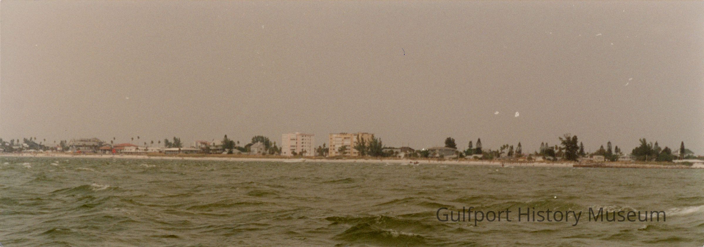 A color photograph of St. Pete Beach from the northeast from Boca Ciega Bay showing buildings along the shore. The sky is grey and the water is choppy.