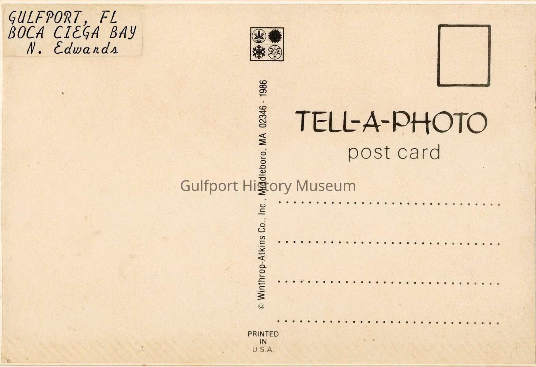 A color photograph postcard of a boat on the shore of Boca Ciega Bay in Gulfport.