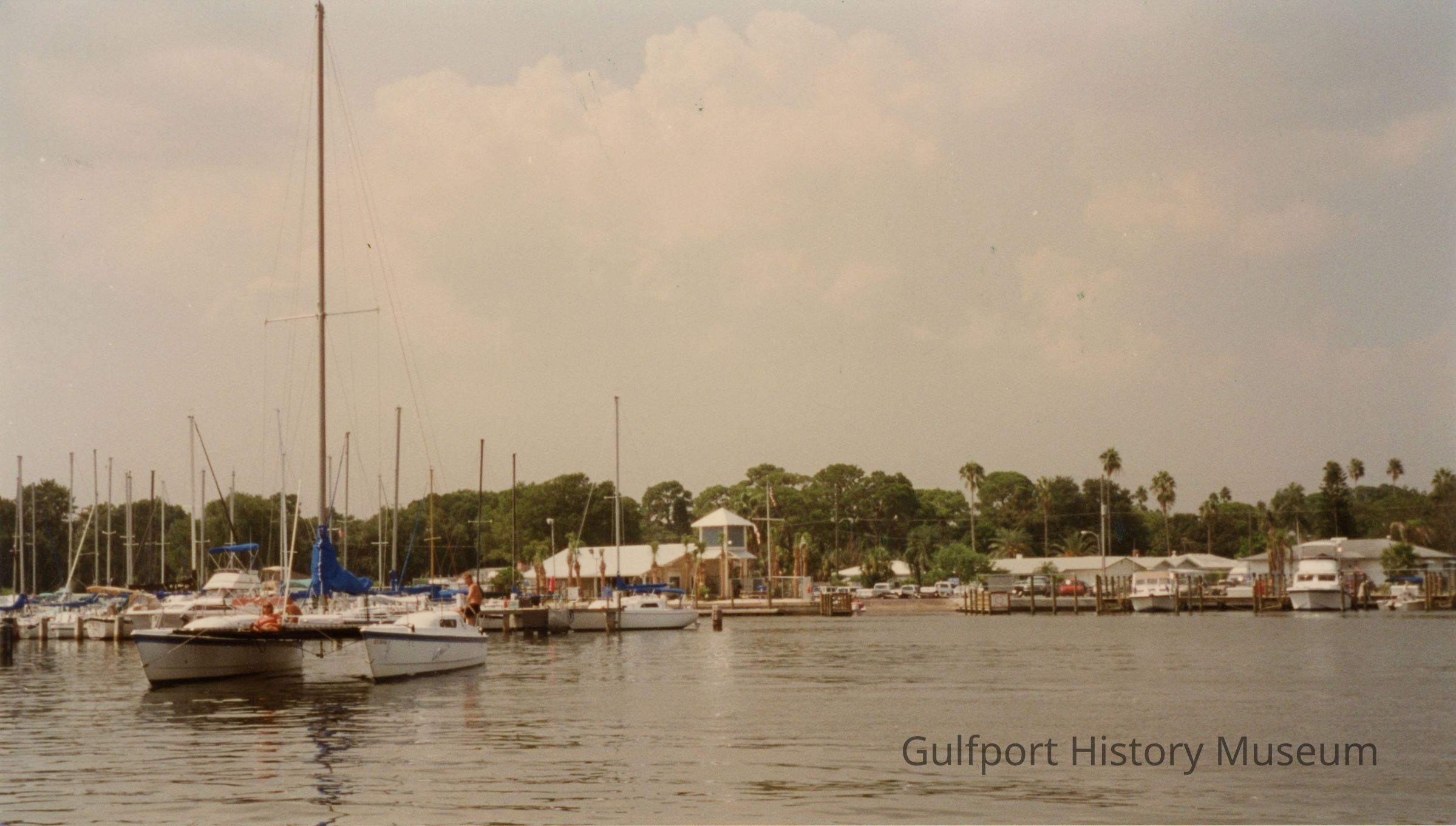 A slightly faded color photograph of several sailboats docked at the Gulfport Marina. The marina building can be seen across the water.