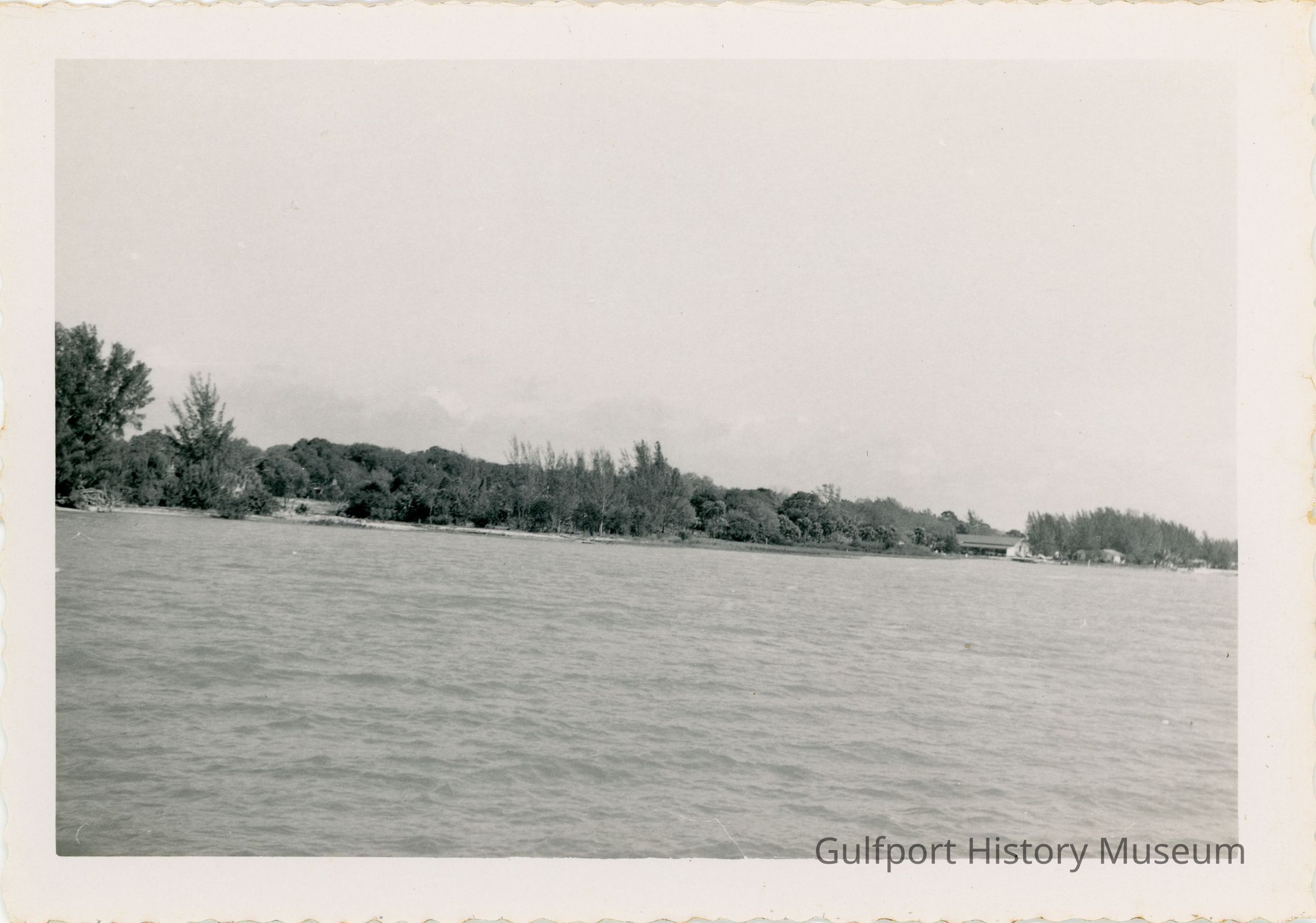 A black and white photograph of the coast of Gulfport from Boca Ciega Bay. Trees line the shore.