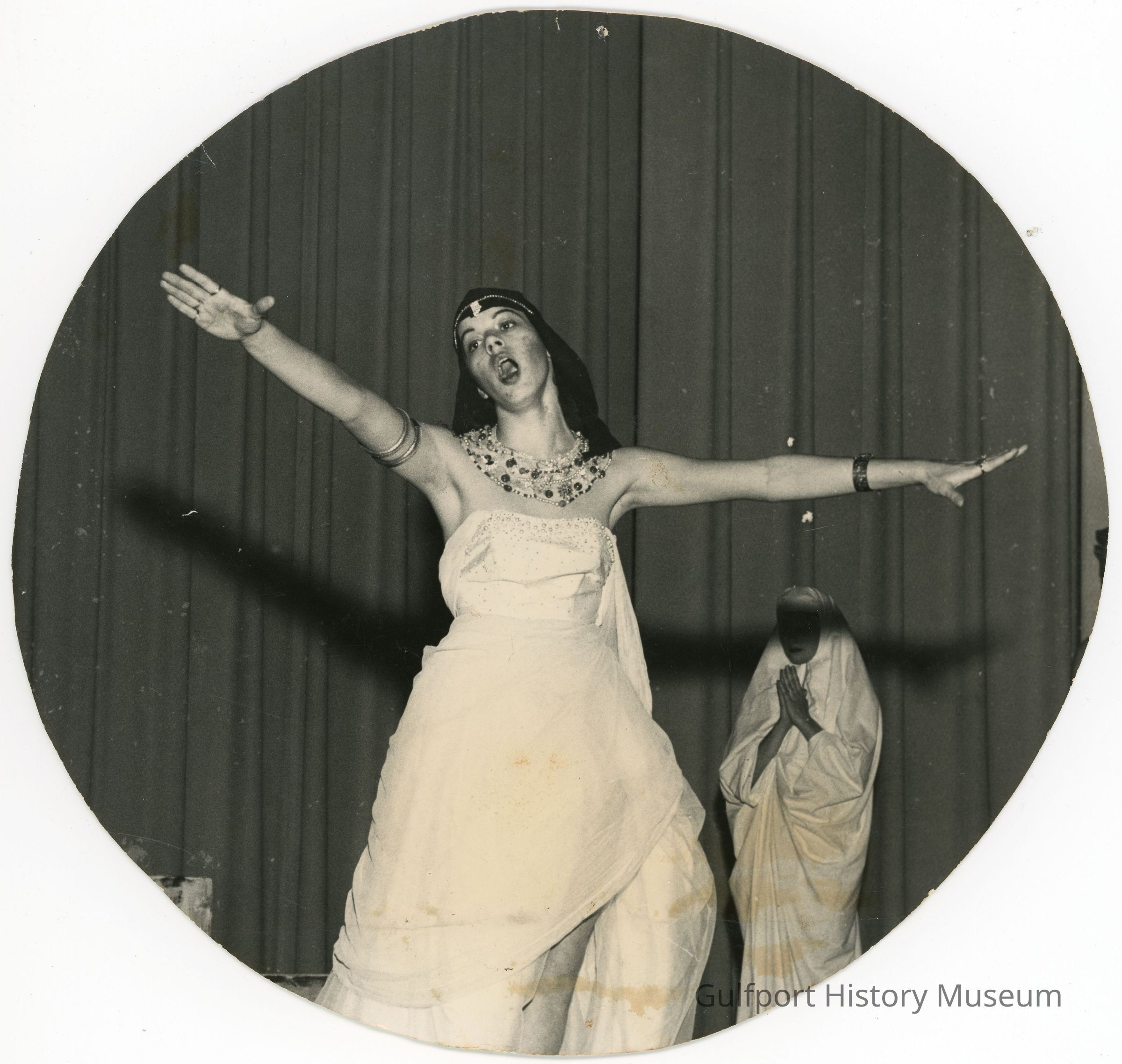 A black and white photograph of a student performing a [play set in Ancient Egypt]. Another student is visible in the background.