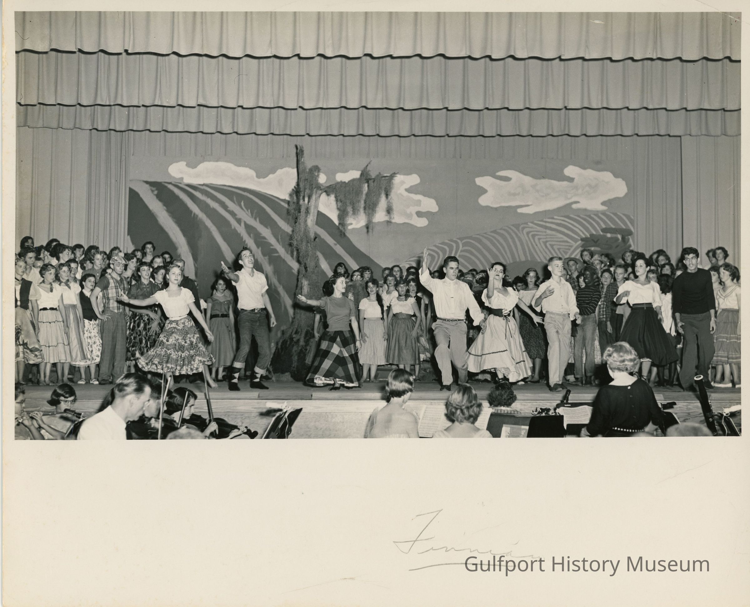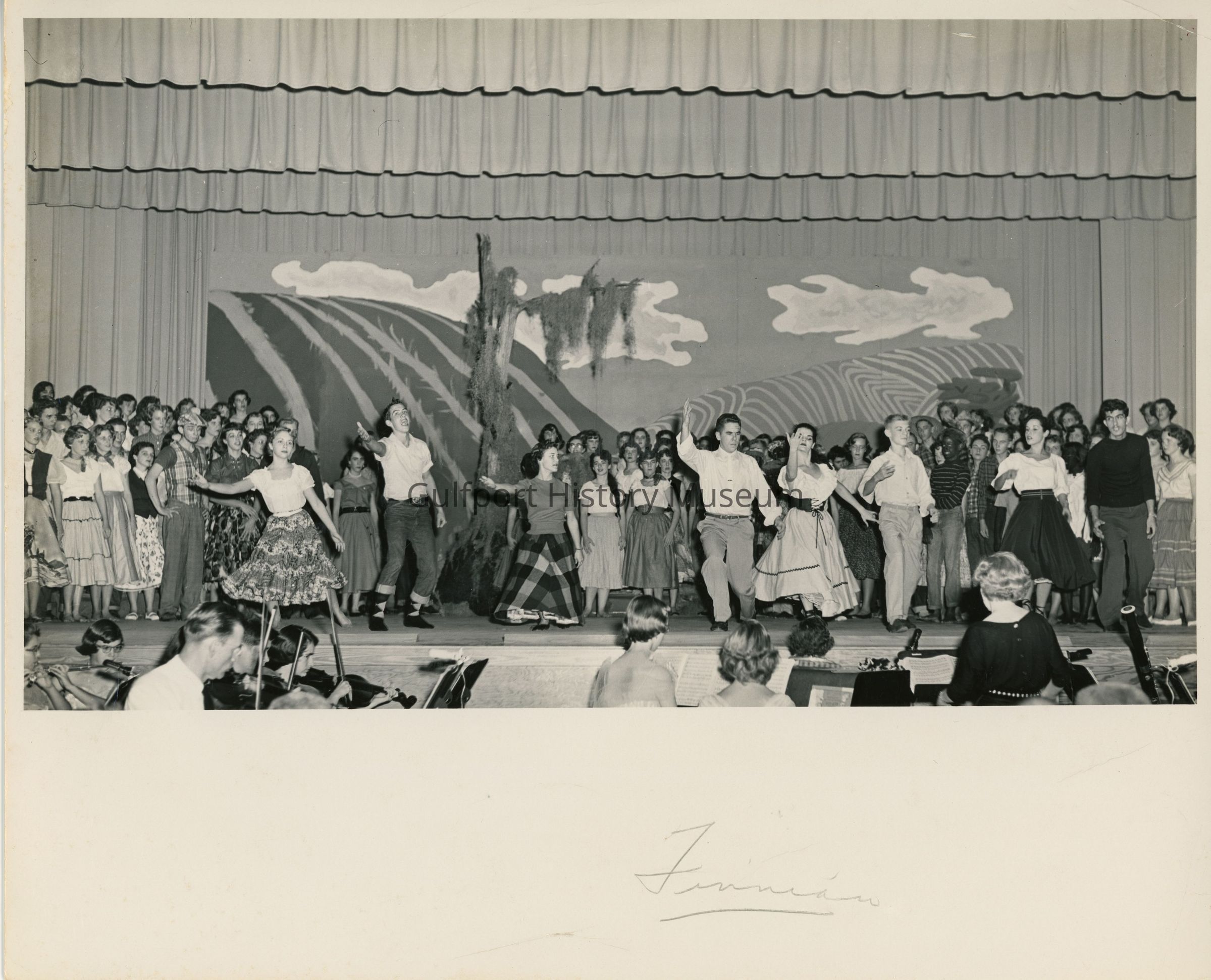 A black and white photograph of students performing [Finian's Rainbow] onstage. "Finnian"