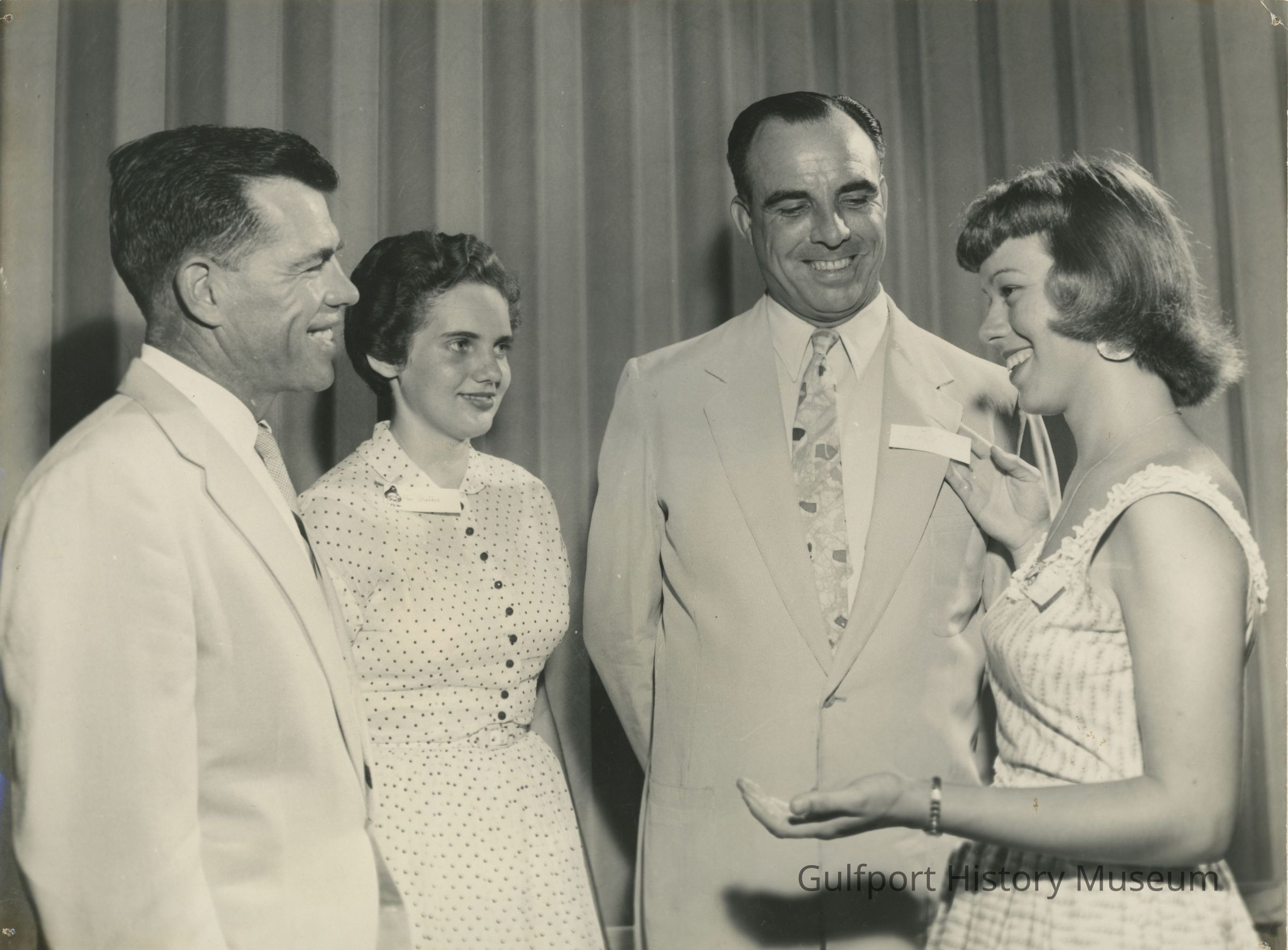 A black and white photograph of two men speaking with two [Boca Ciega High School students]. One of the men is wearing a [name tag]. The two students are wearing name tags featuring a pirate image; the student on the left's name tag reads "Pam Shaffer."Photograph Details