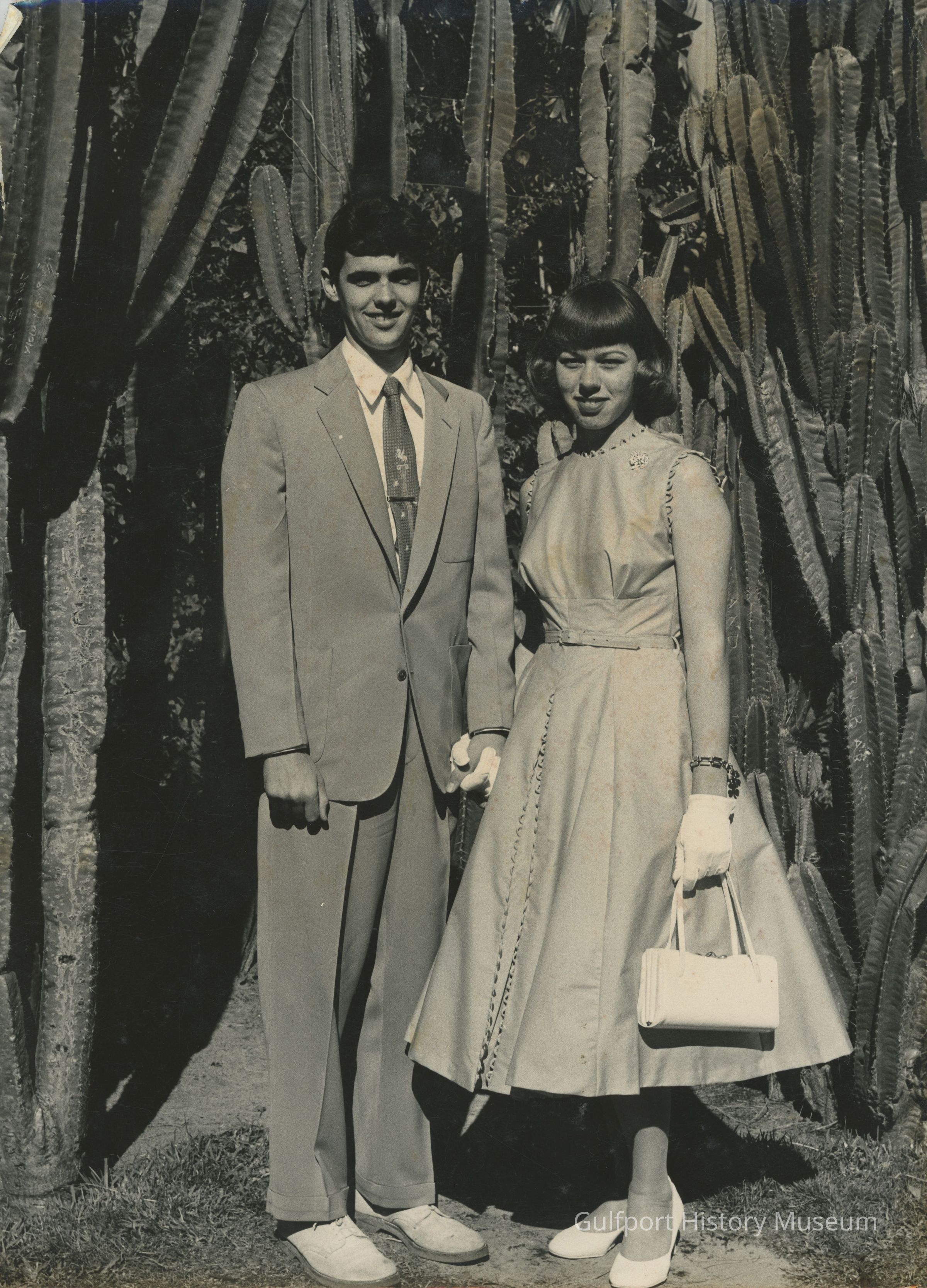 A black and white photograph of two [students] posing for a photograph in front of cactuses. They hold hands.