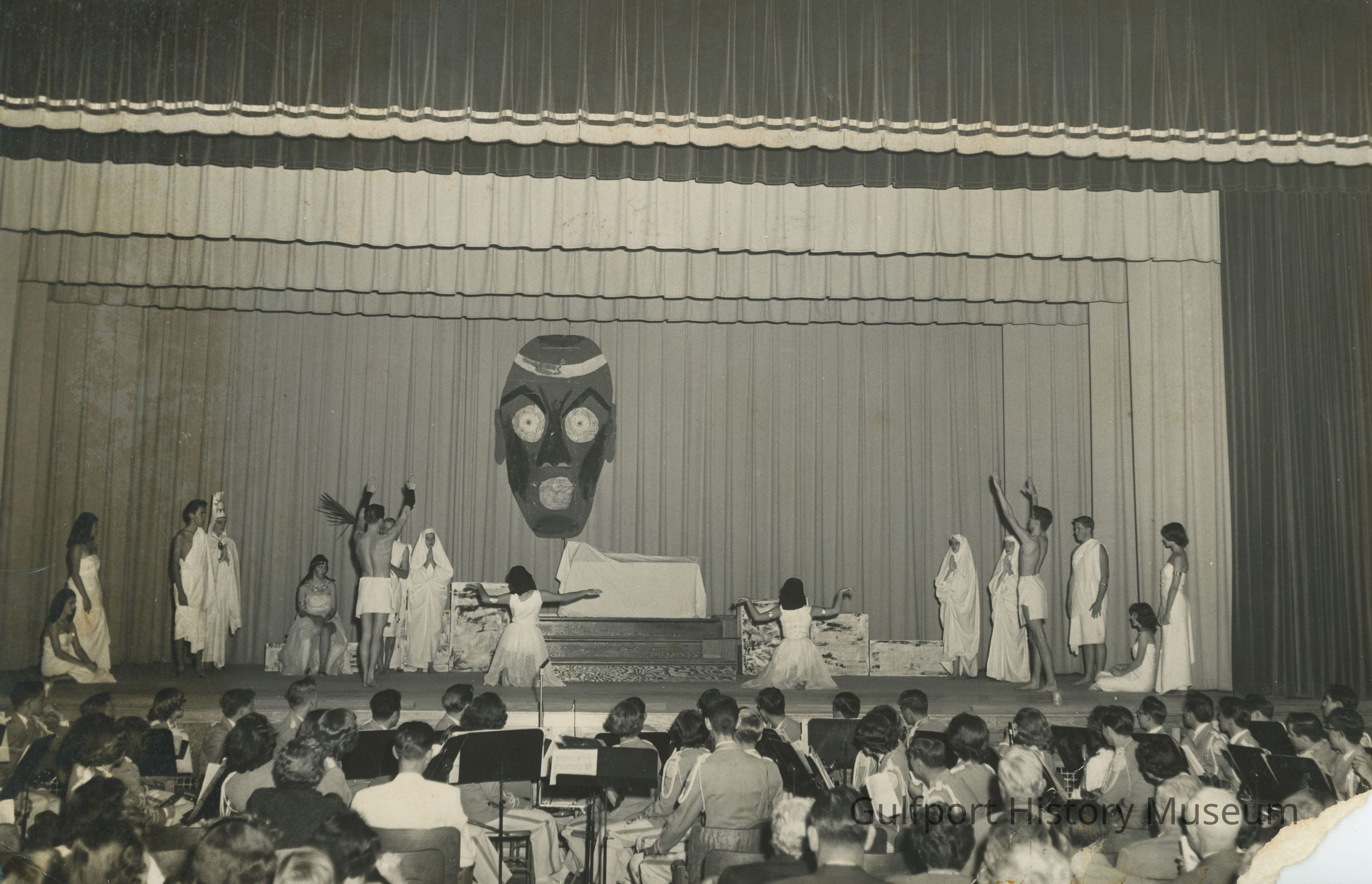 A black and white photograph of a student performance of a [play set in Ancient Egypt].