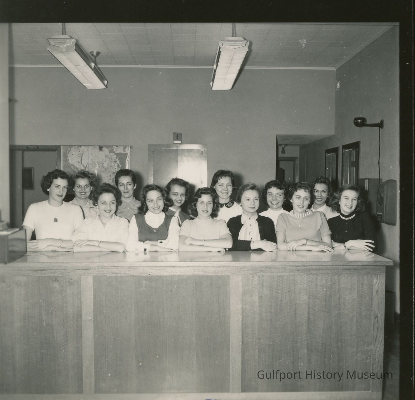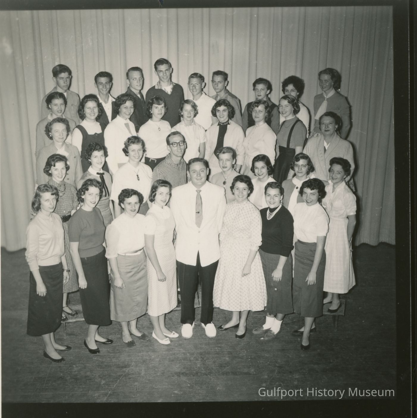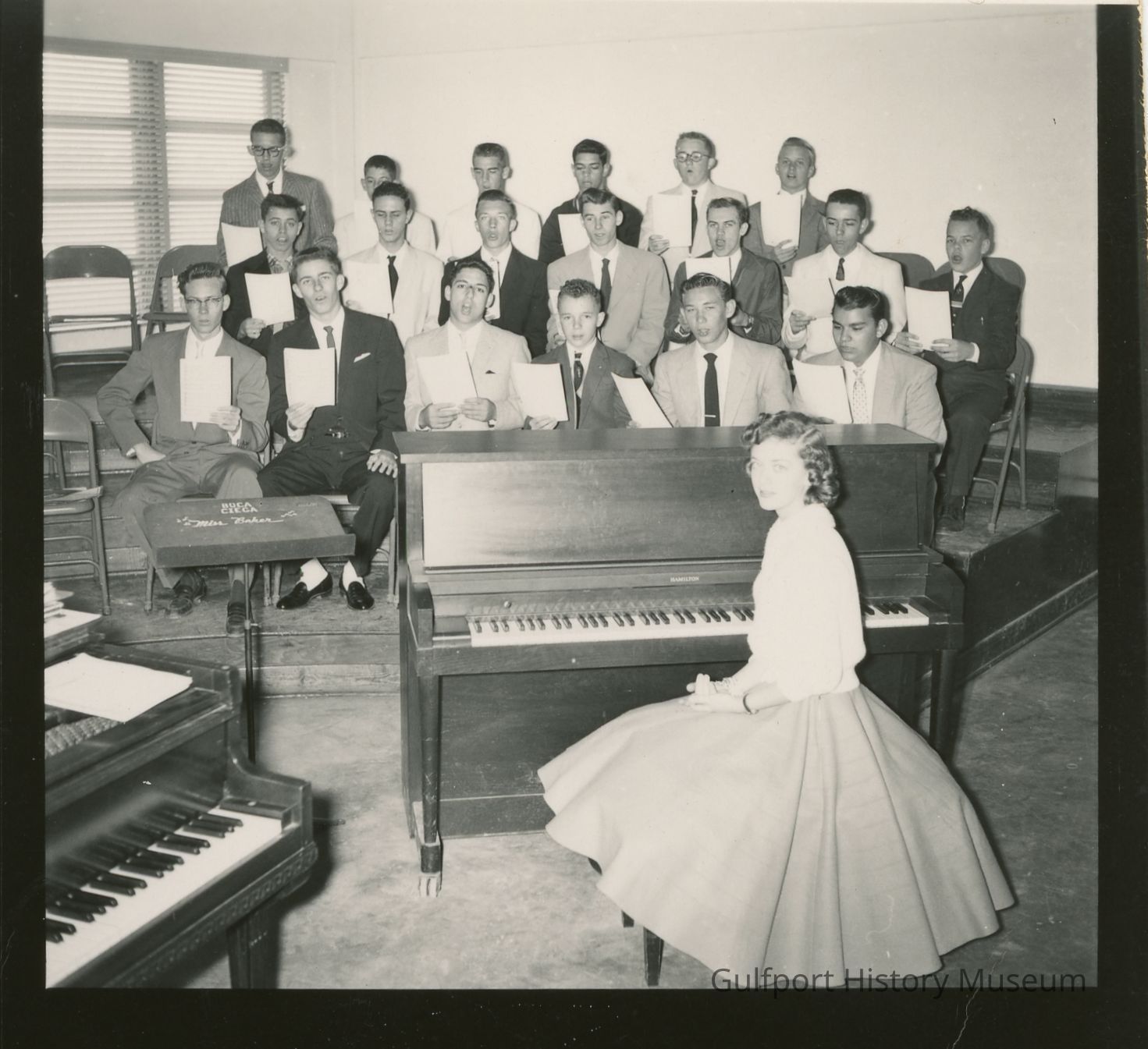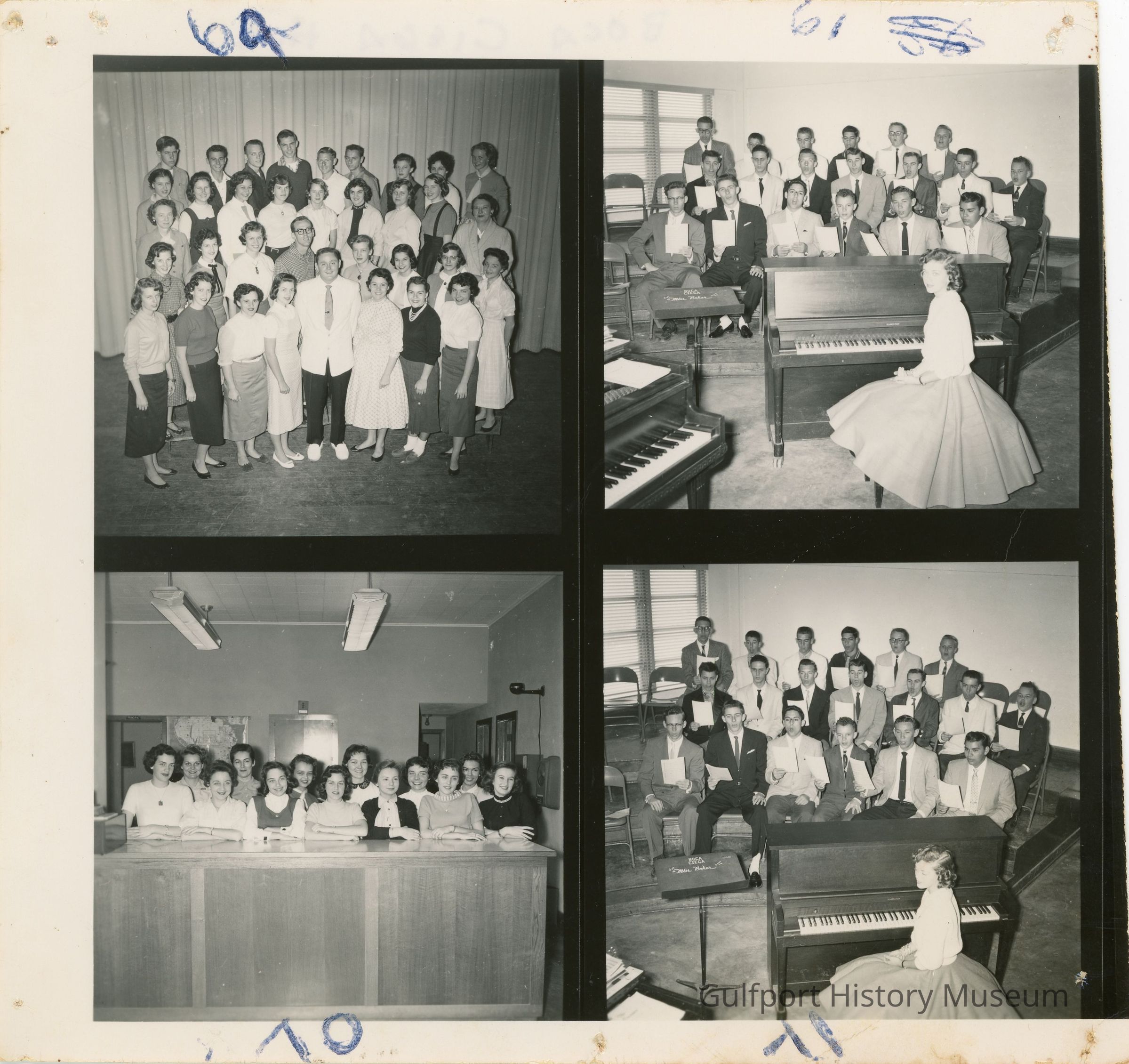 A black and white photograph of four photographs. B ("60") shows a group of students standing in four rows on a stage. D ("70") shows a group of 13 female students standing behind an office counter. C ("61") and E ("71") show a male student choir with female accompanist or teacher at different angles.