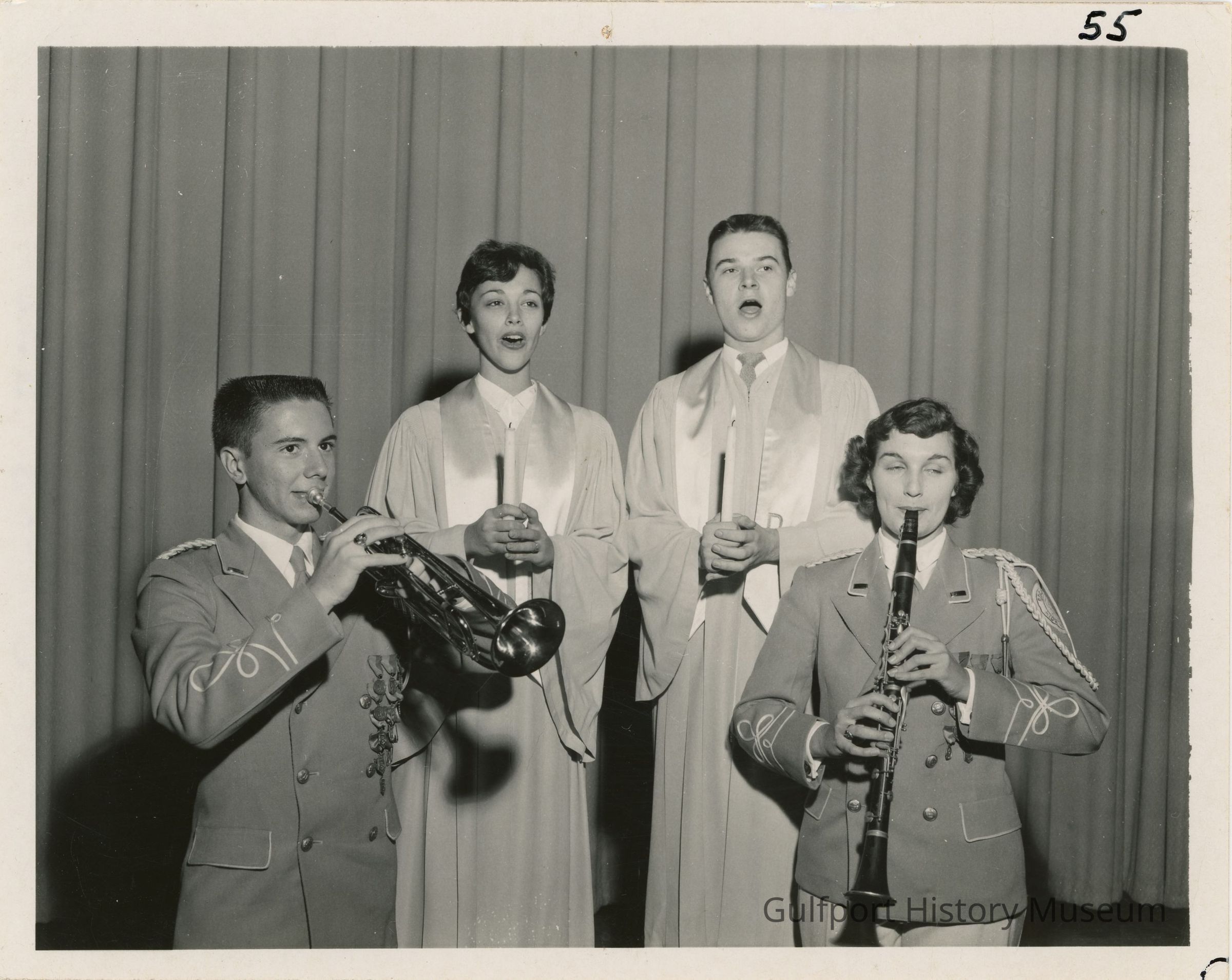 A black and white photograph of four students, two singing and two playing instruments; a trumpet and a clarinet.