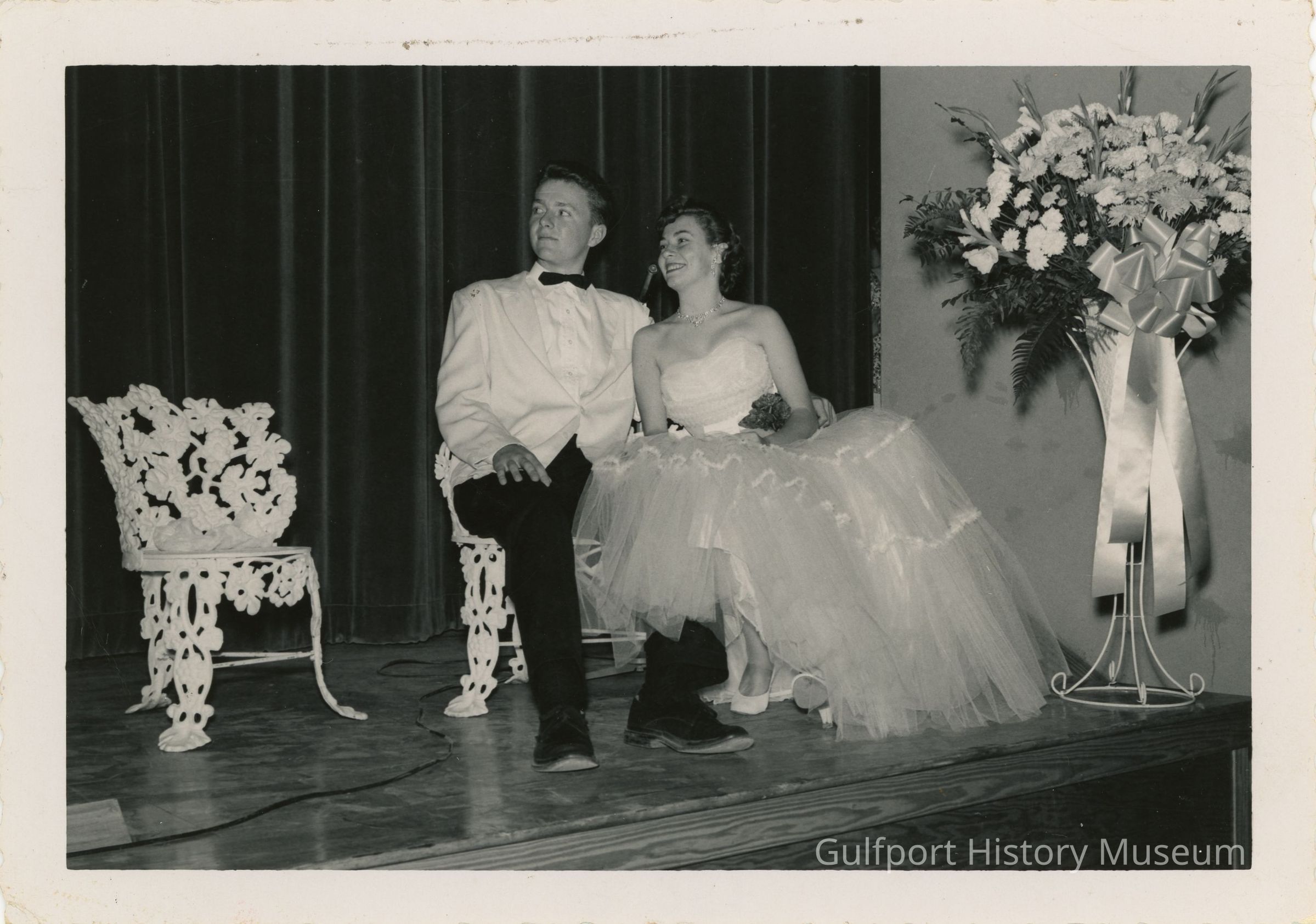 A black and white photograph of a male and female student in formal wear sitting on a stage. A large flower arrangement stands next to them. They look to their right.
