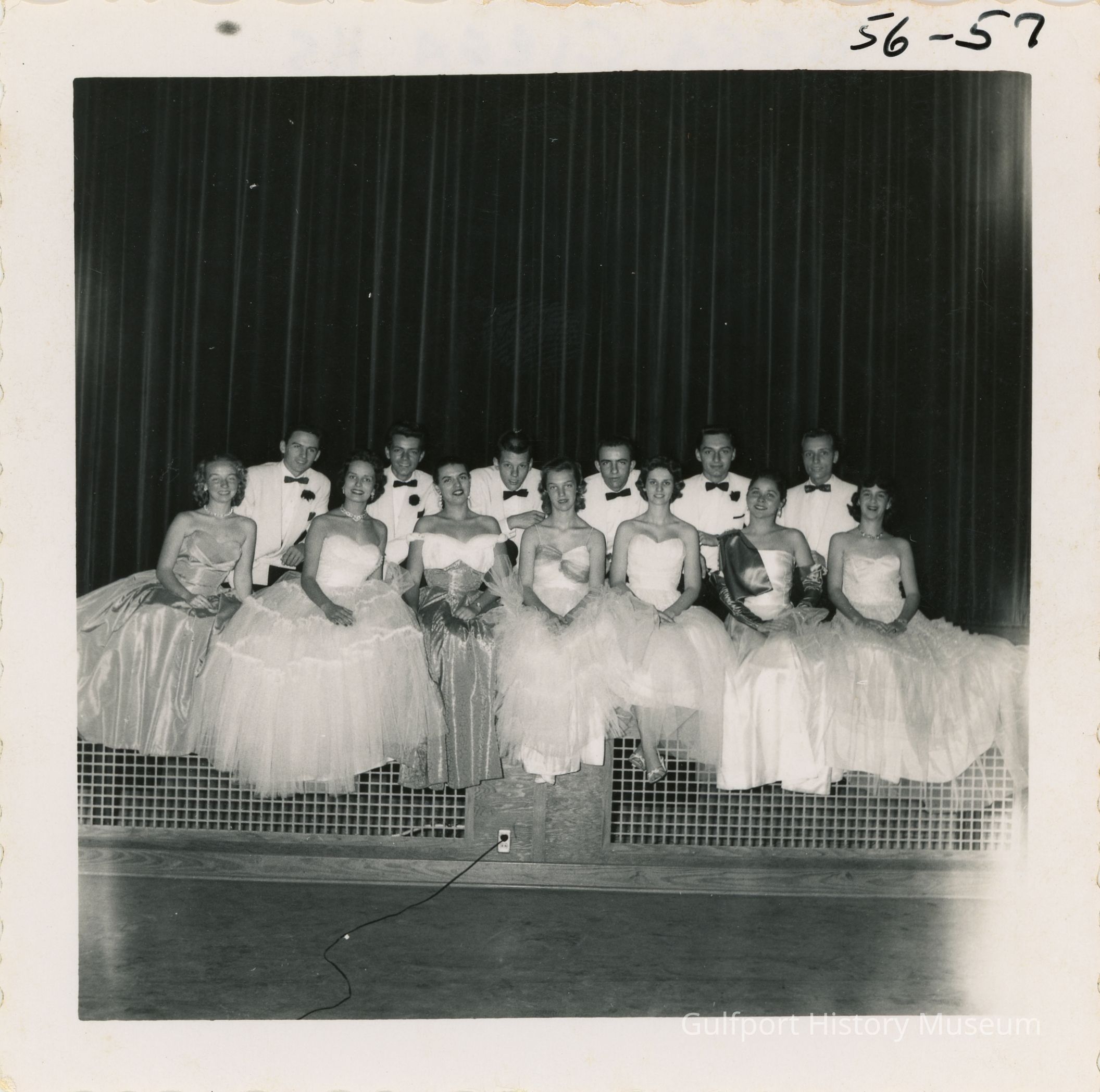 A black and white photograph of 6 male and 6 female students [of the Baker's Dozen] sitting on the edge of a stage in formal wear.