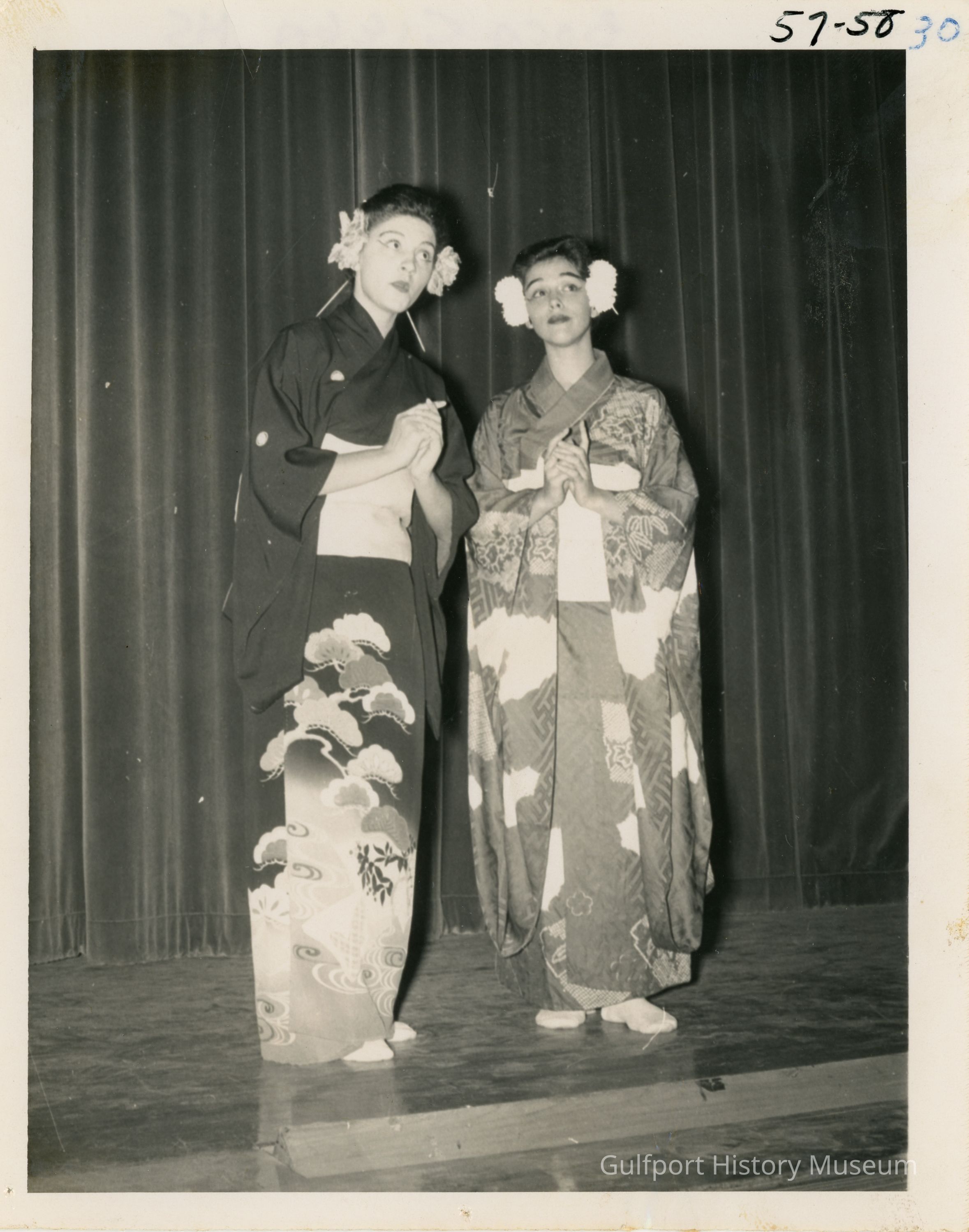 A black and white photograph of two students performing on stage wearing kimono and exaggerated eye makeup.Photograph Details