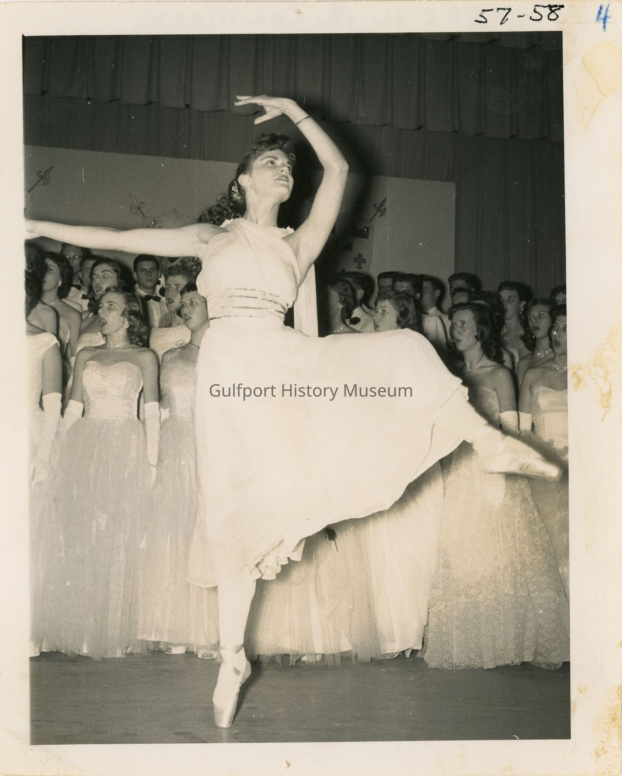 A black and white photograph of a student performance. [Sherry McCormack] dances in ballet shoes in front of a singing choir.