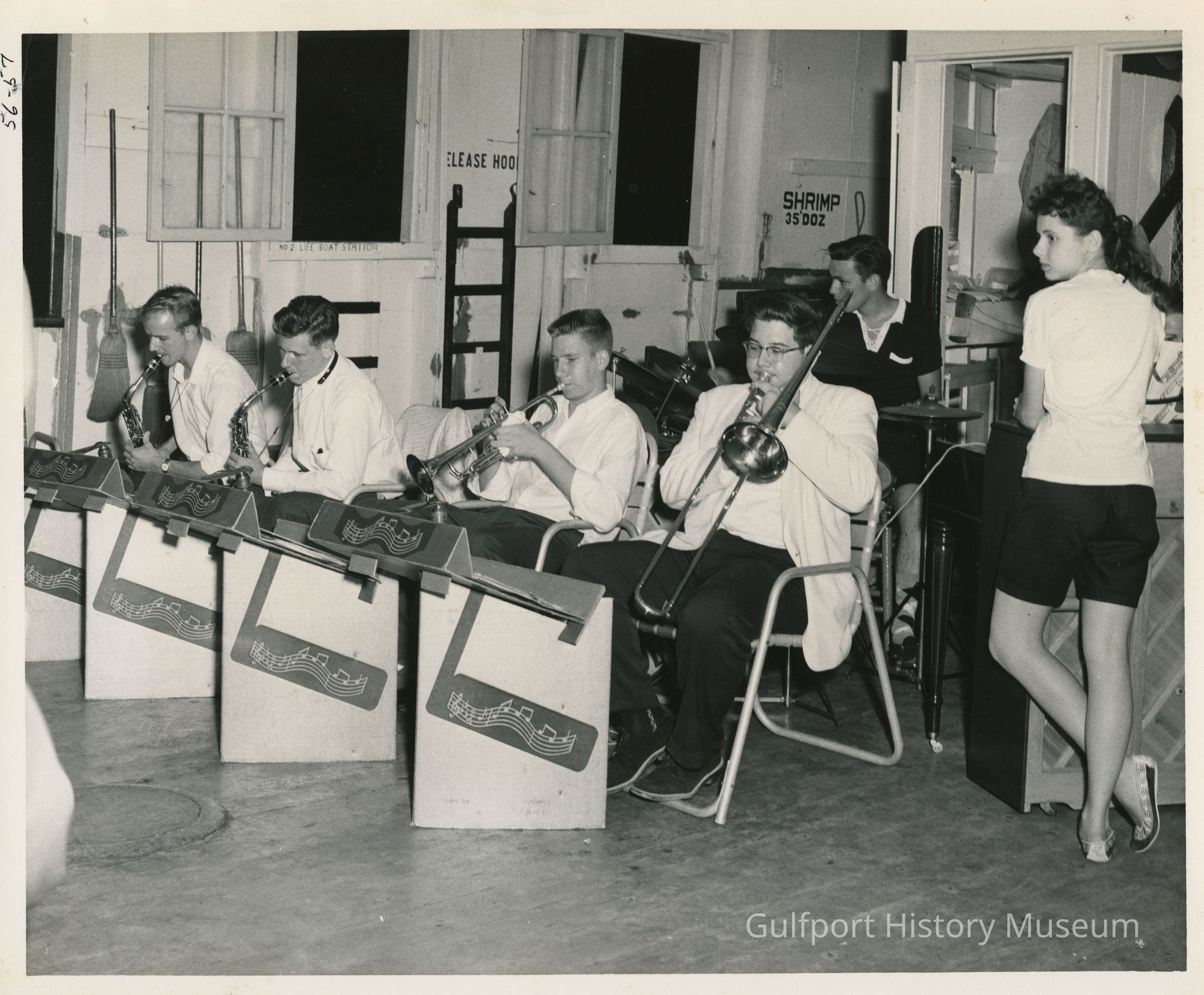 A black and white photograph of a [dance/event]. Musicians sit in chairs playing brass instruments and drums. A girl stands by an upright piano.