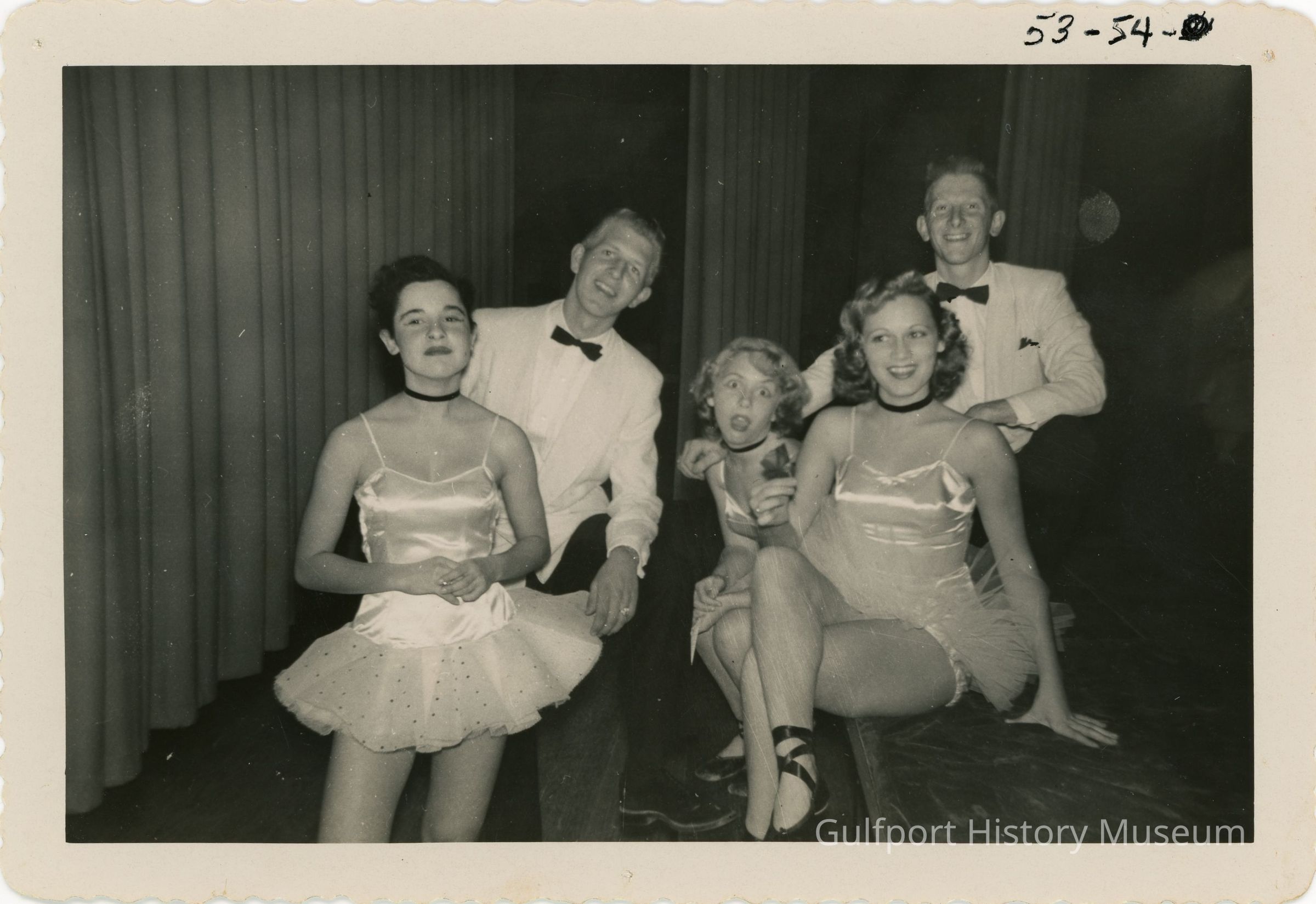 A black and white photograph of five students [onstage/backstage].