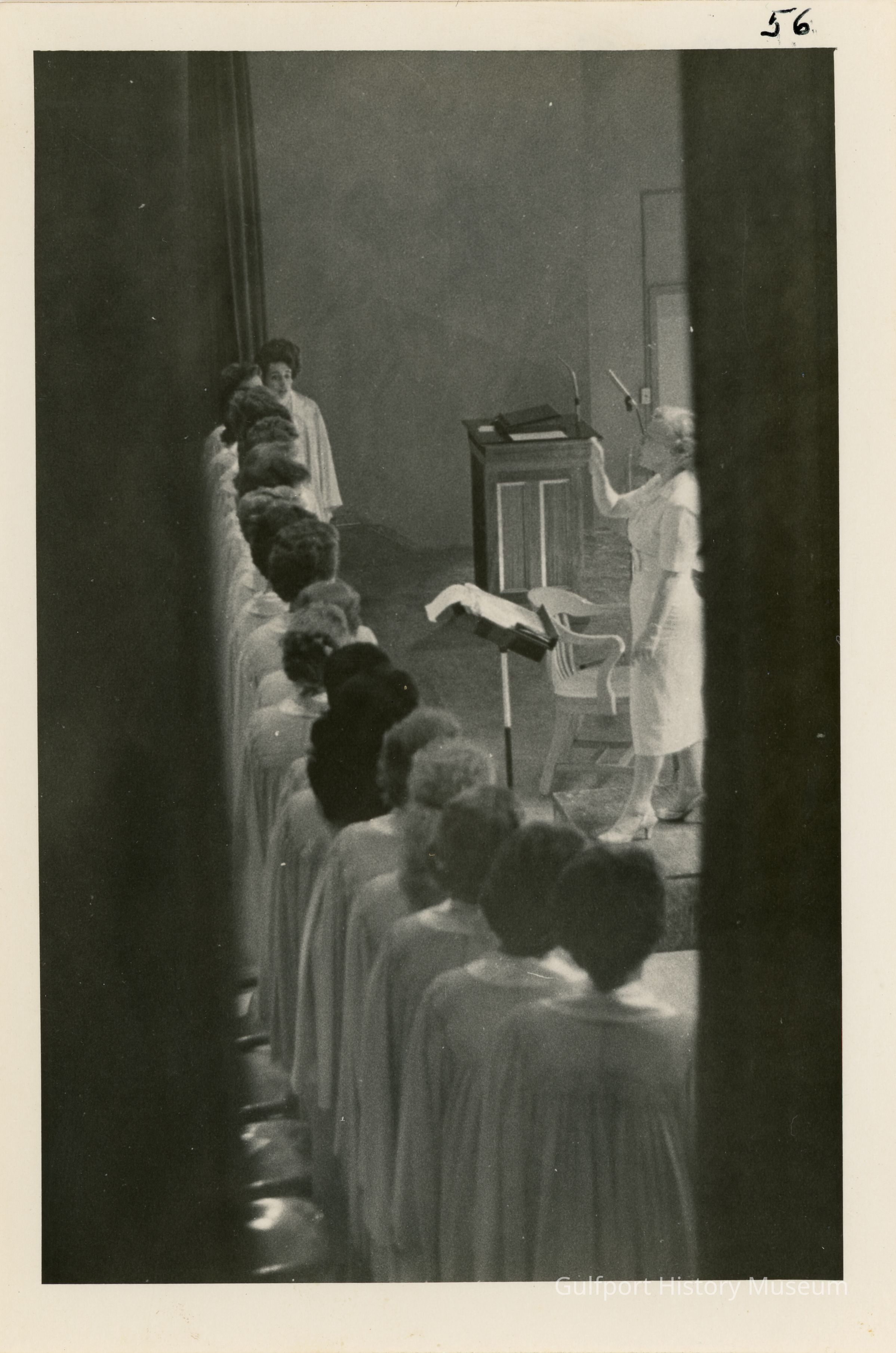 A black and white photograph of a chorus performance from side of stage. Chorus and Glee Club instructor Christine Baker conducts.