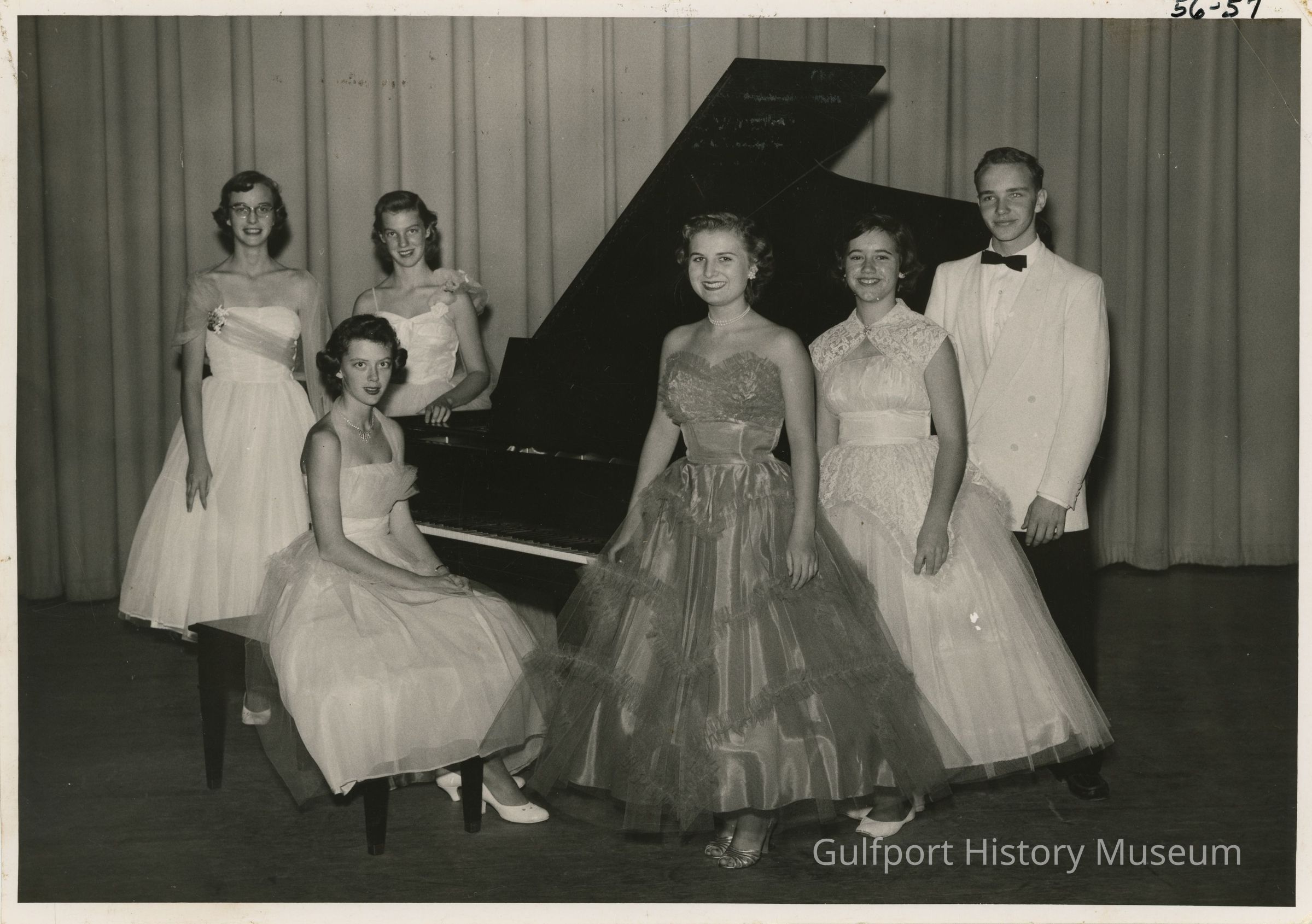 A black and white photograph of six student accompanists with a grand piano; one student is sitting on the piano bench. They are dressed in formal wear.