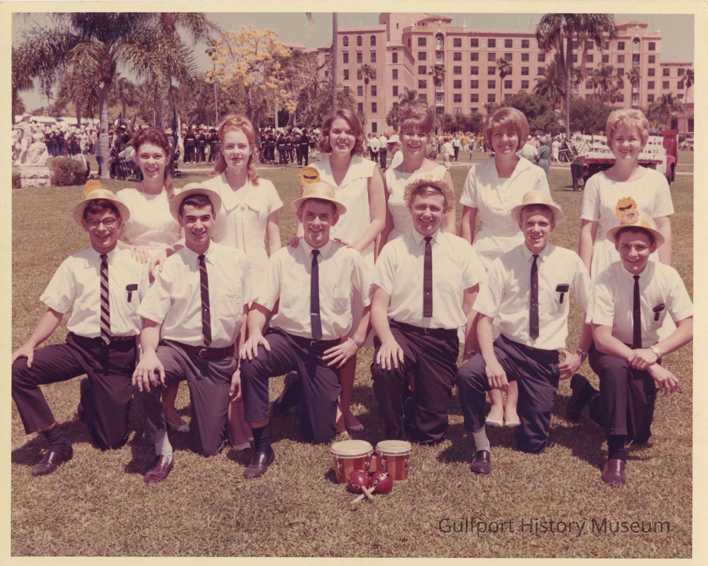 A color photograph of twelve students [of the Baker's Dozen] in North Straub Park in St. Petersburg. Mini bongos and maracas lie in the grass in front of them. The Vinoy is visible in the background.