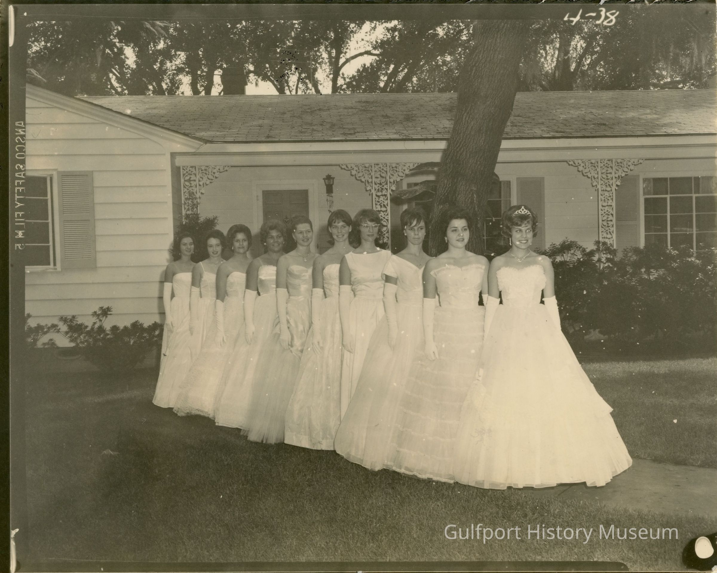 A black and white photograph of a ten female students in formal wear [for prom] posing for photos in the front yard of a house.
