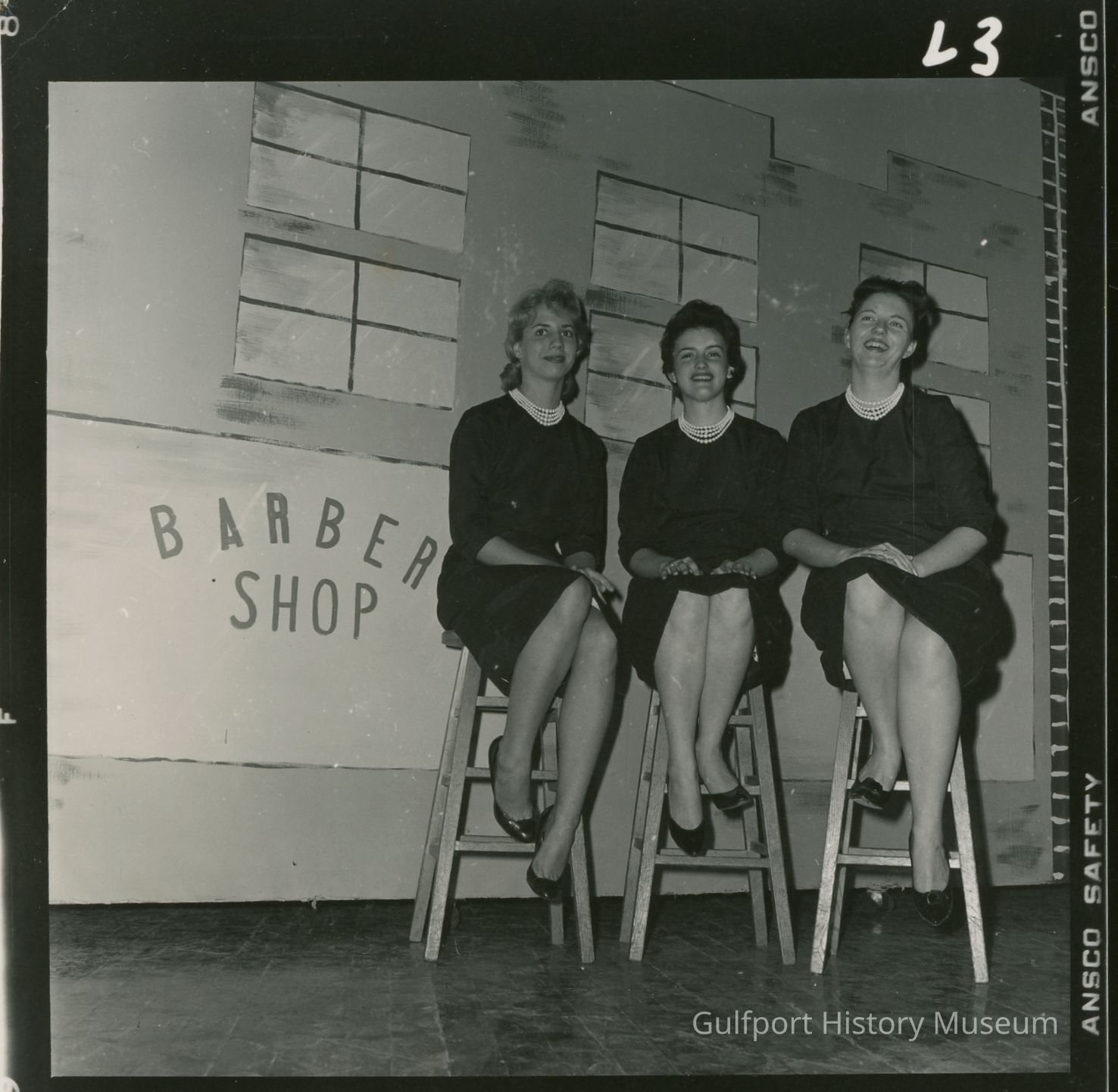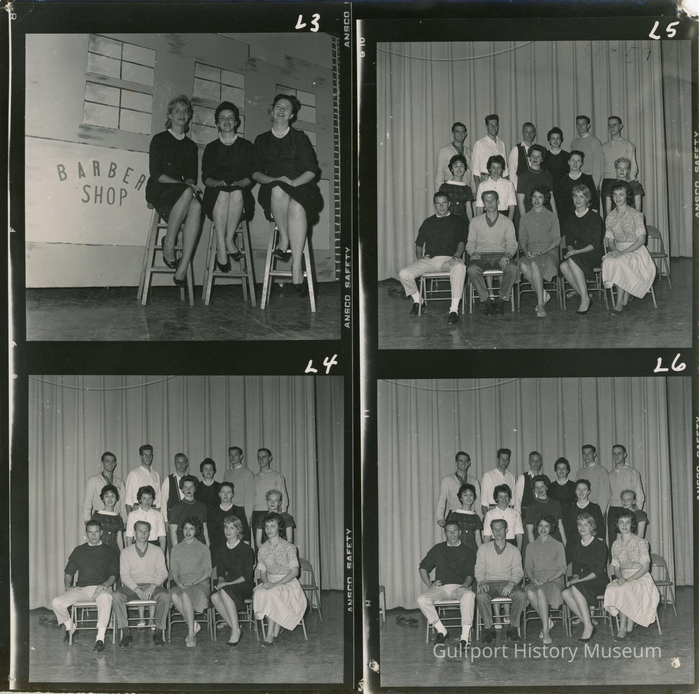 Four black and white photographs. L3 shows three female students sitting on stools in front of a [stage backdrop] that reads "BARBER SHOP." L4, L5, and L6 show 16 students in three rows [on a stage.]