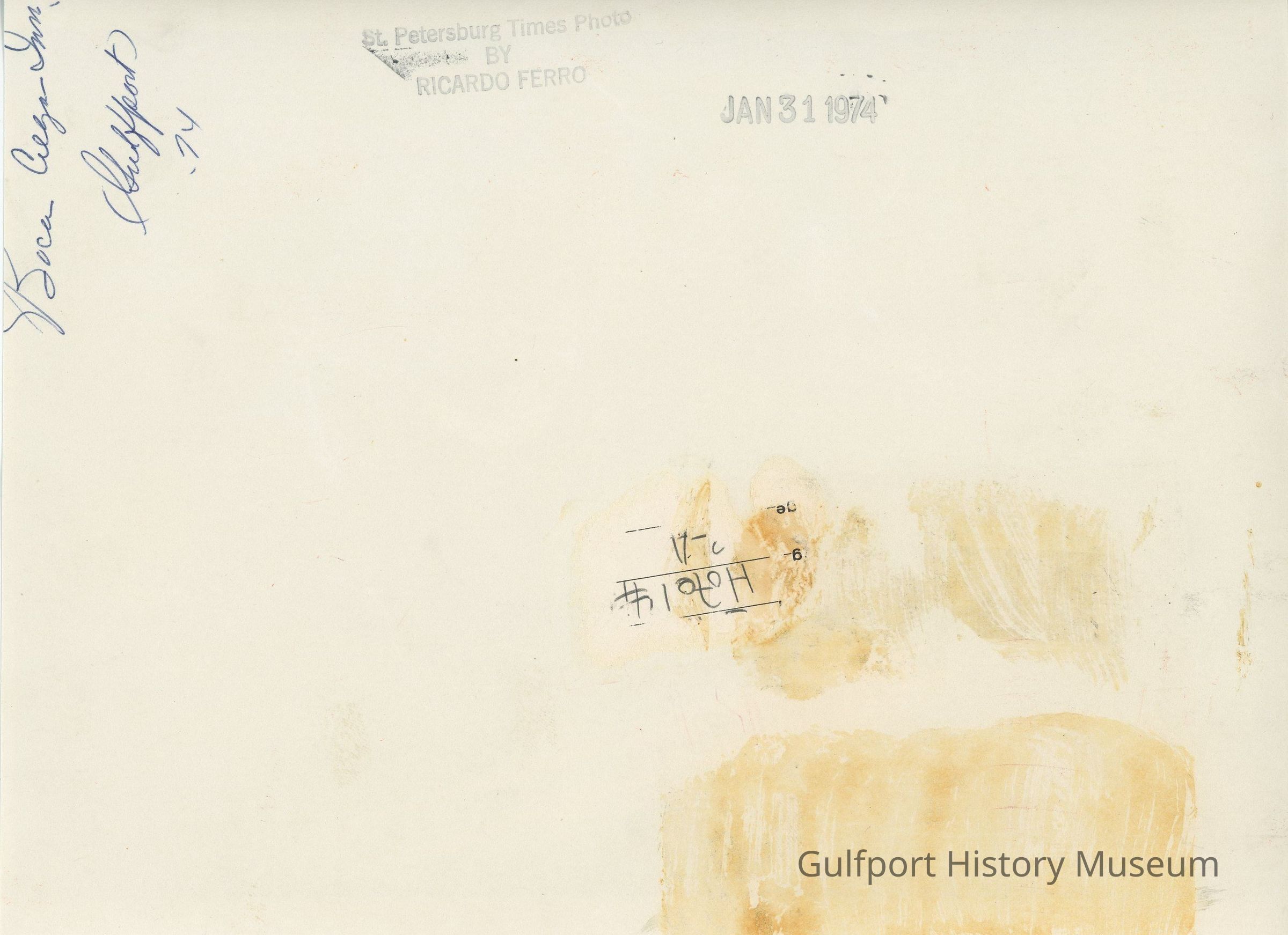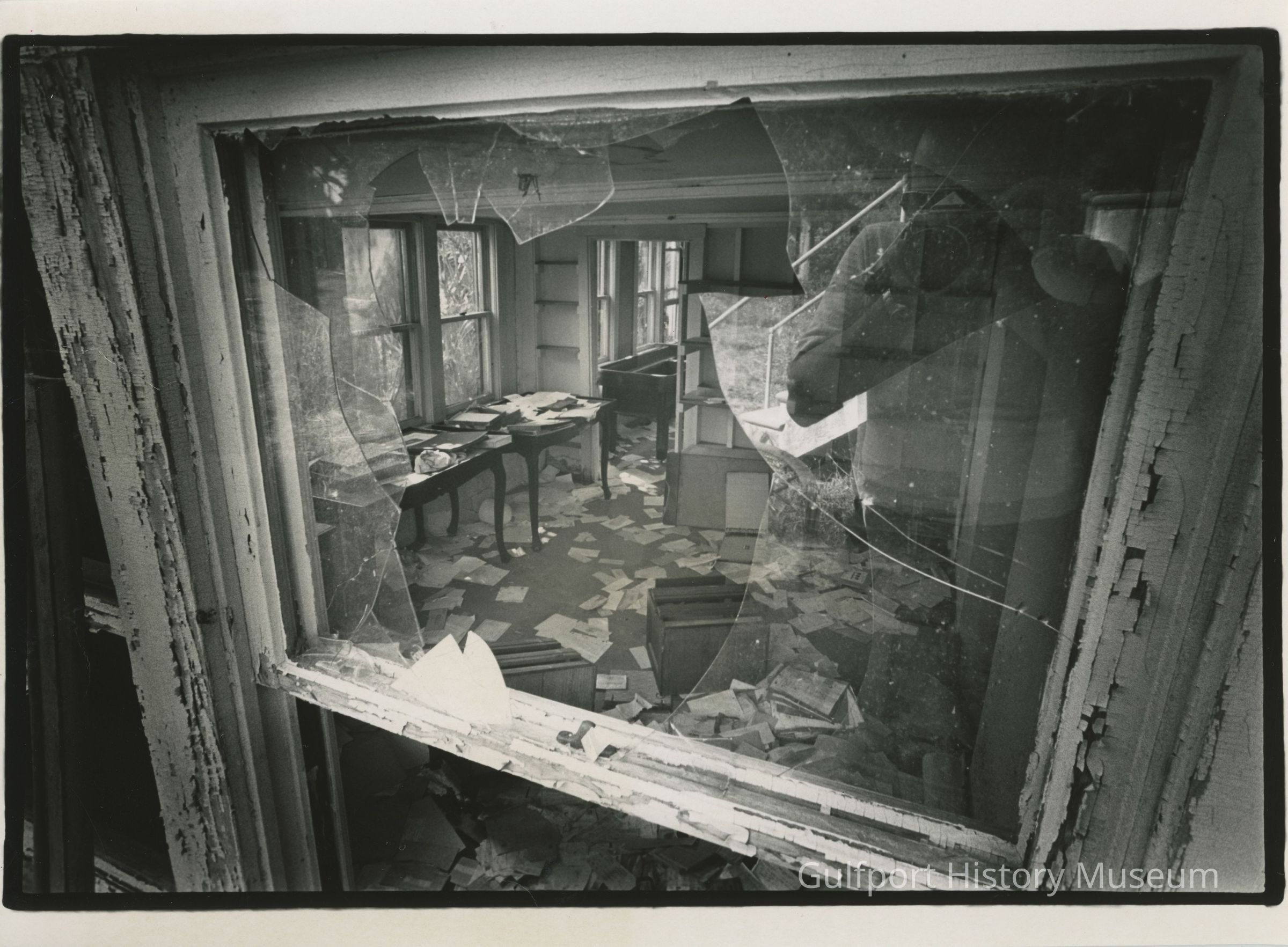 A black and white photograph looking through a broken window into a room of the Boca Ciega Inn. Some furniture is toppled over and the floor is covered with scattered paper and other items. The photographer's reflection is visible in the remaining window glass.