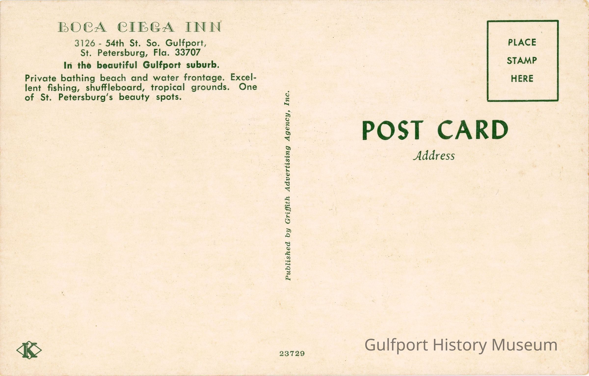 BOCA CIEGA INN / 54th Street & 31st Avenue So Gulfport, / St. Petersburg, Fla. 33707 /In the beautiful Gulfport suburb. / Private bathing beach and water frontage. Excel- / lent fishing, shuffleboard, tropical grounds. One / of St. Petersburg's beauty spots.Transcriber