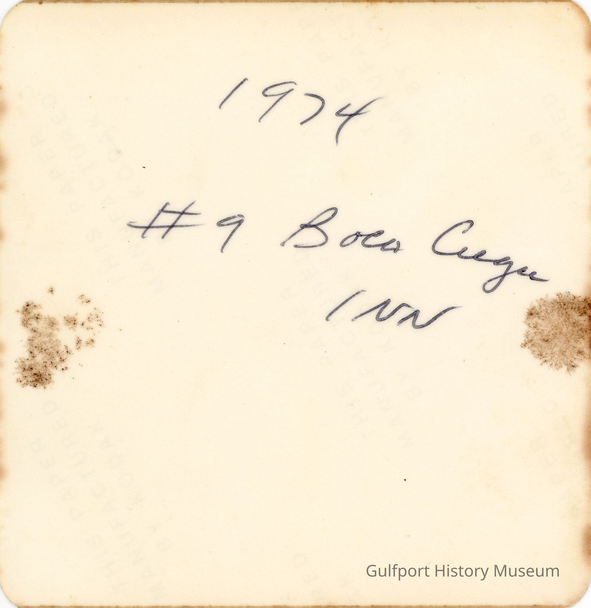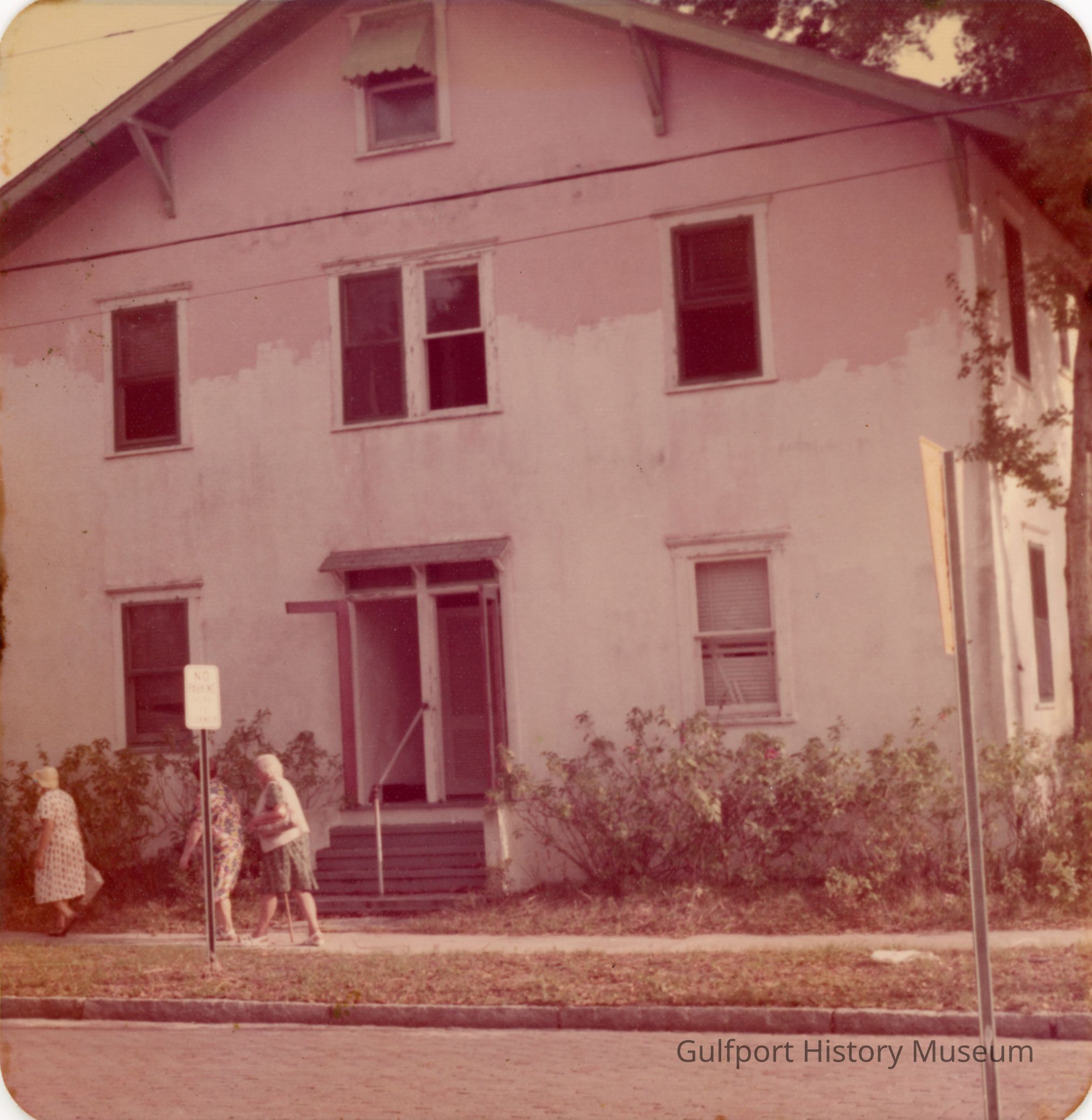 A color photograph of the Boca Ciega Inn during its demolition. The exterior doors have been removed. Some of the blinds in the first floor windows are broken. Some of the windows are open. There are three women walking down the street past the building on 54th St S.