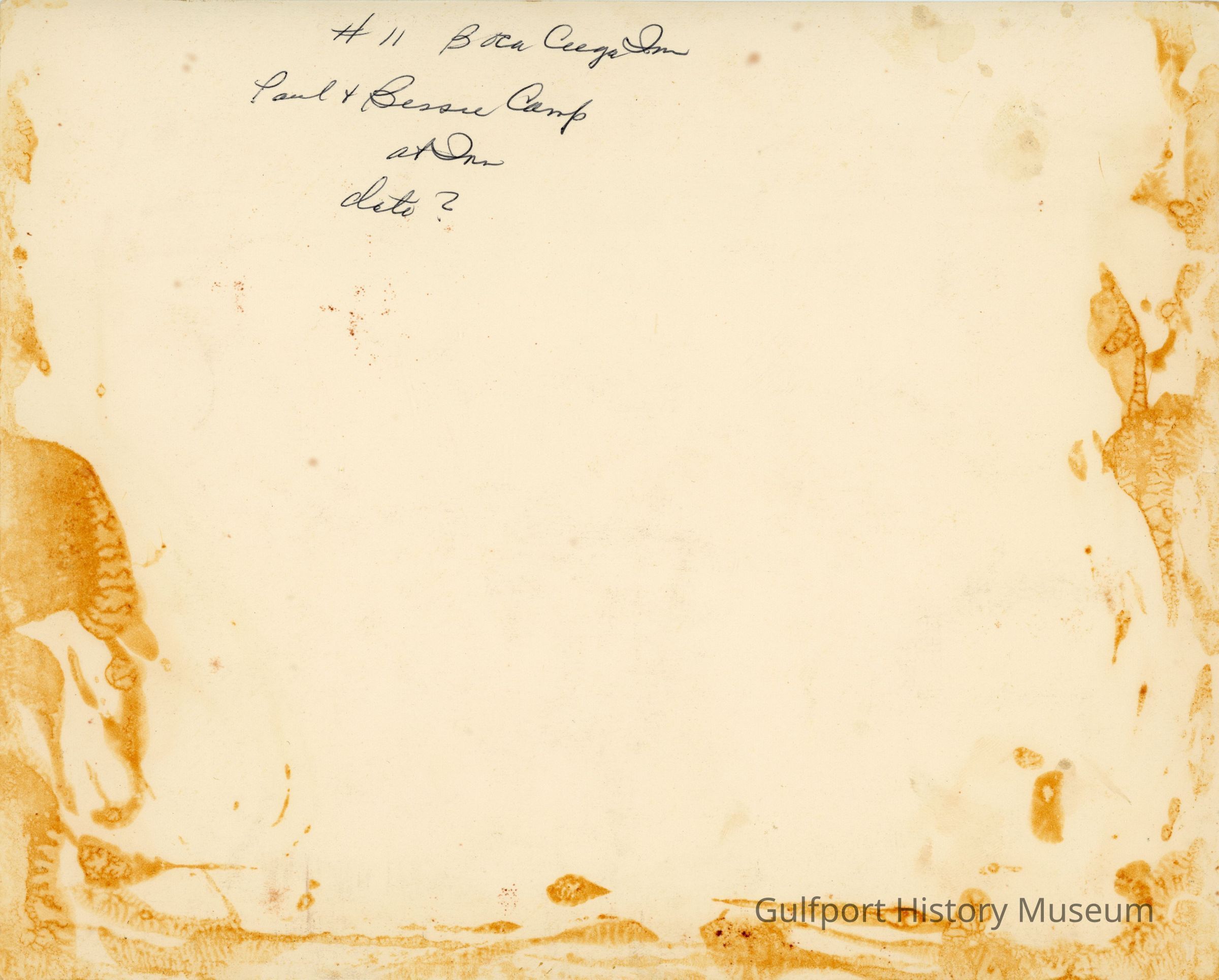 A black and white photograph of Paul Camp (L) and Bessie Camp (M) standing with an unknown gentleman behind a banquet table full of flowers with large decorative bowls and a large white dessert. There are cards on the back of the table. The table is covered in a white cloth.