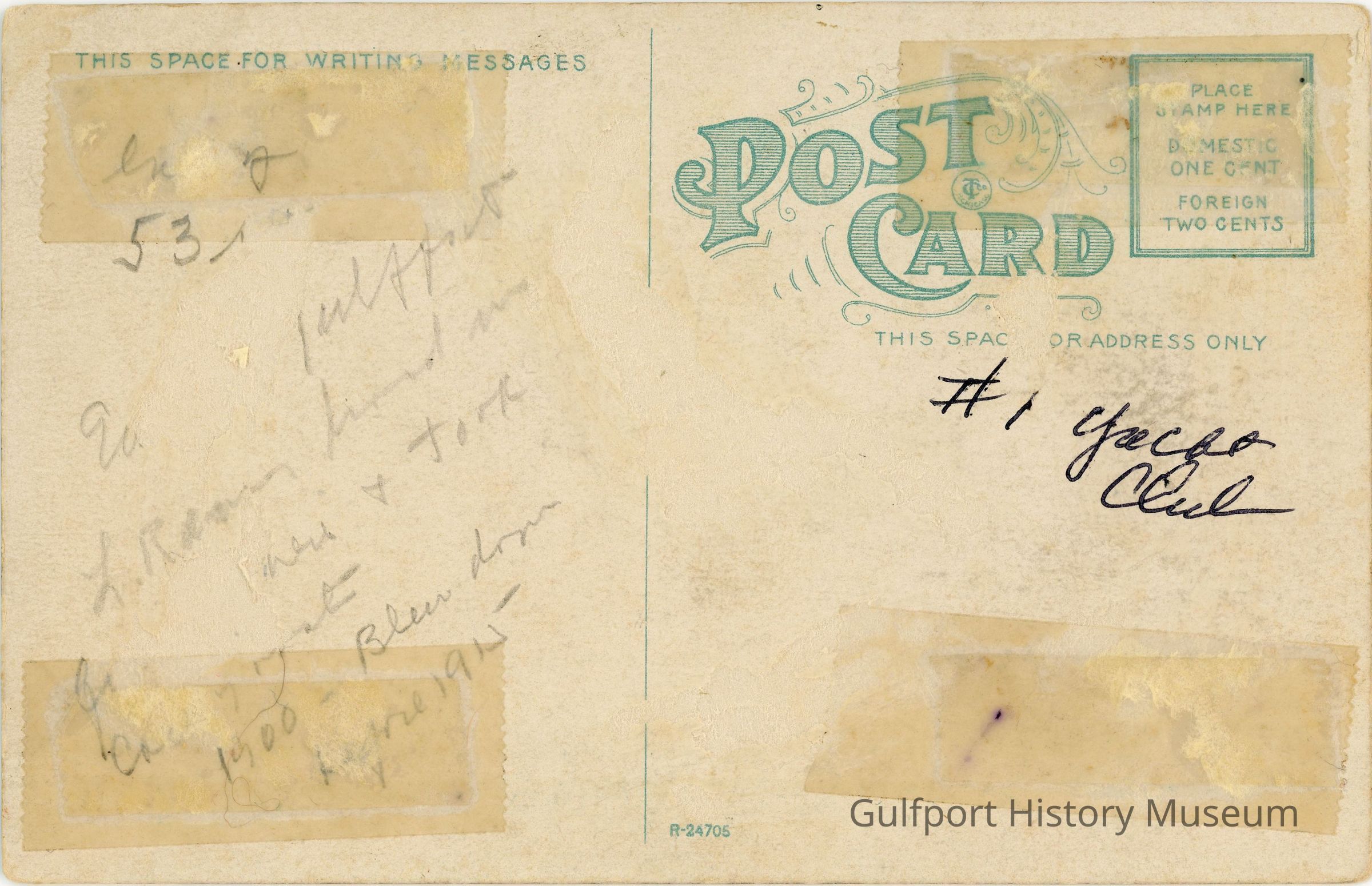 In 2 [?] / 53 / Ea [?] Gulfport / L. Ra[?] [?] in / [?] + took / Ca[?] / 1900 - Blew down / [?] 1915 /#1 Yacht ClubTranscriber