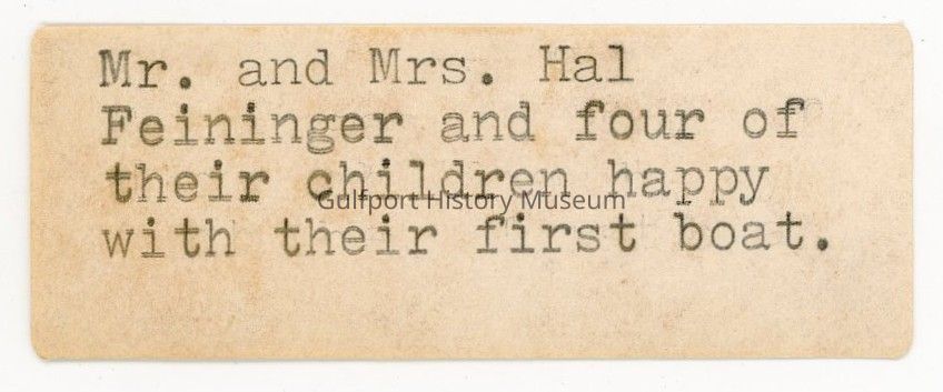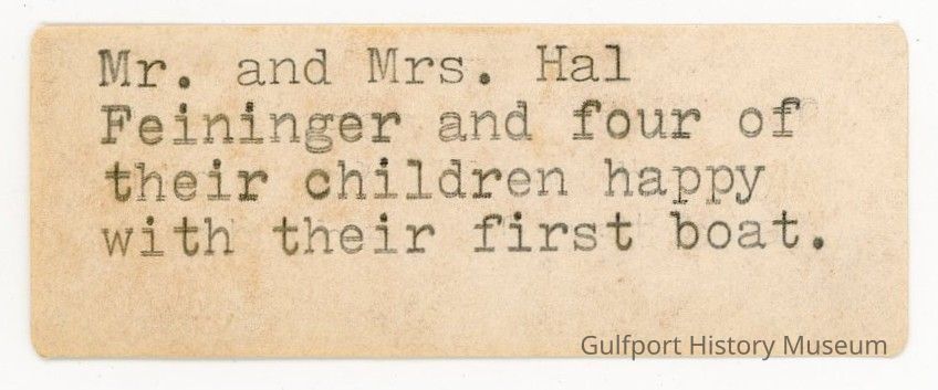 A black and white photograph of Hal Feininger, Joy Feininger, and their children sitting in a boat at the Boca Ciega Yacht Club.