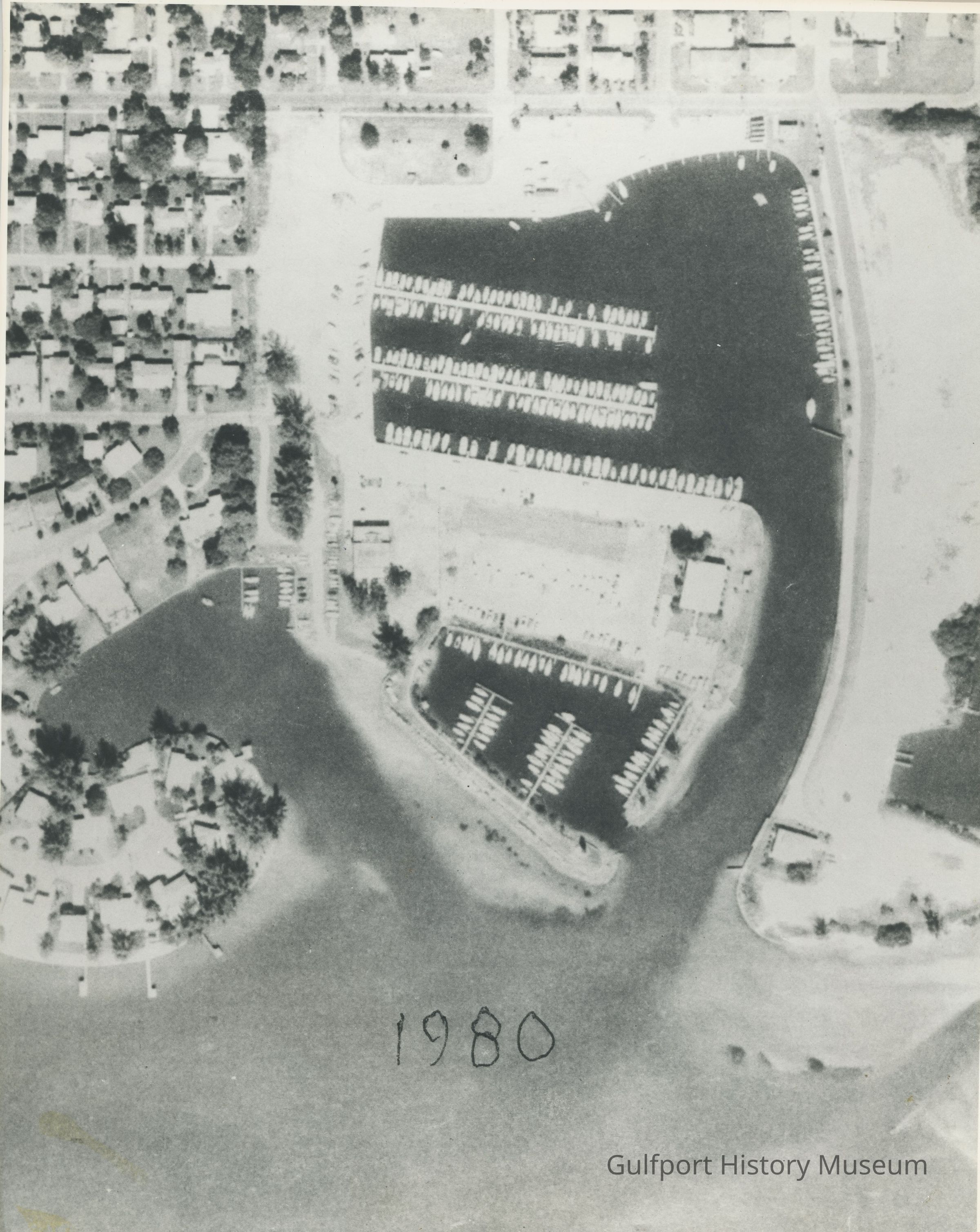 A black and white aerial photograph of the Boca Ciega Yacht Club, Gulfport Marina, Baywood Point, and surrounding homes.