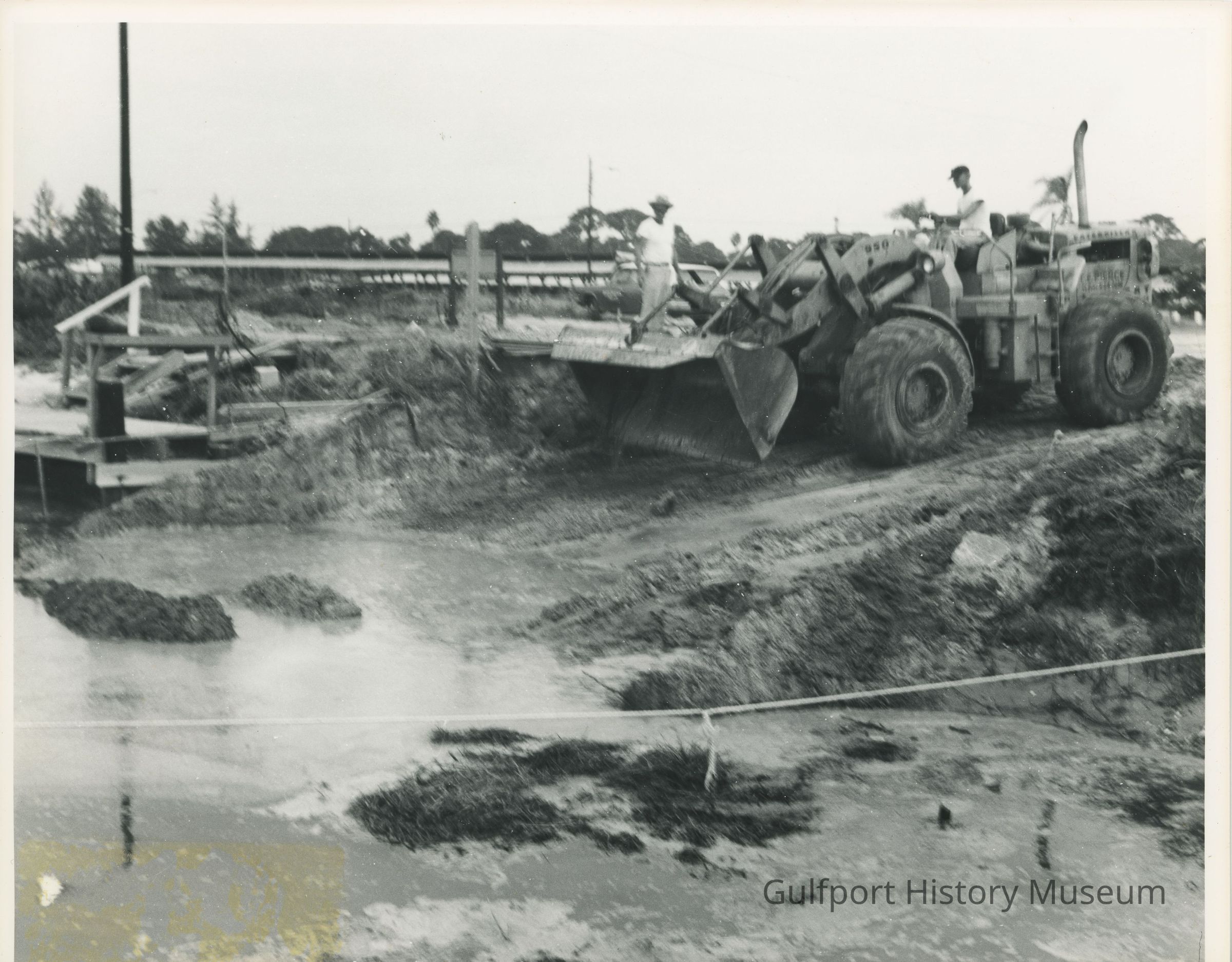 A black and white photograph of a CAT 950 being used in the construction of a boat launching ramp at the Boca Ciega Yacht Club.