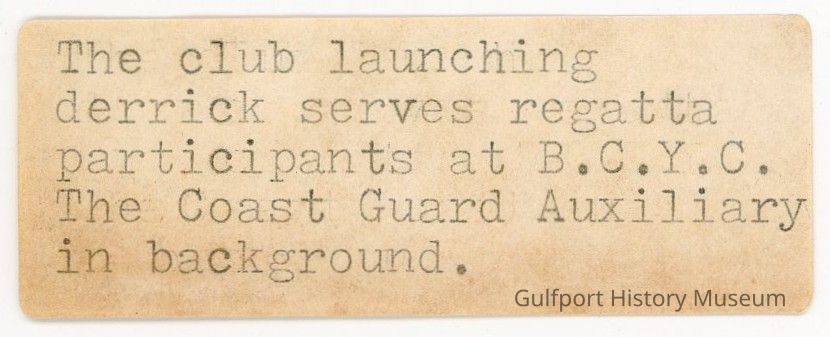 The club launching derrick serves regatta participants at B.C.Y.C. The Coast Guard Auxiliary in background.