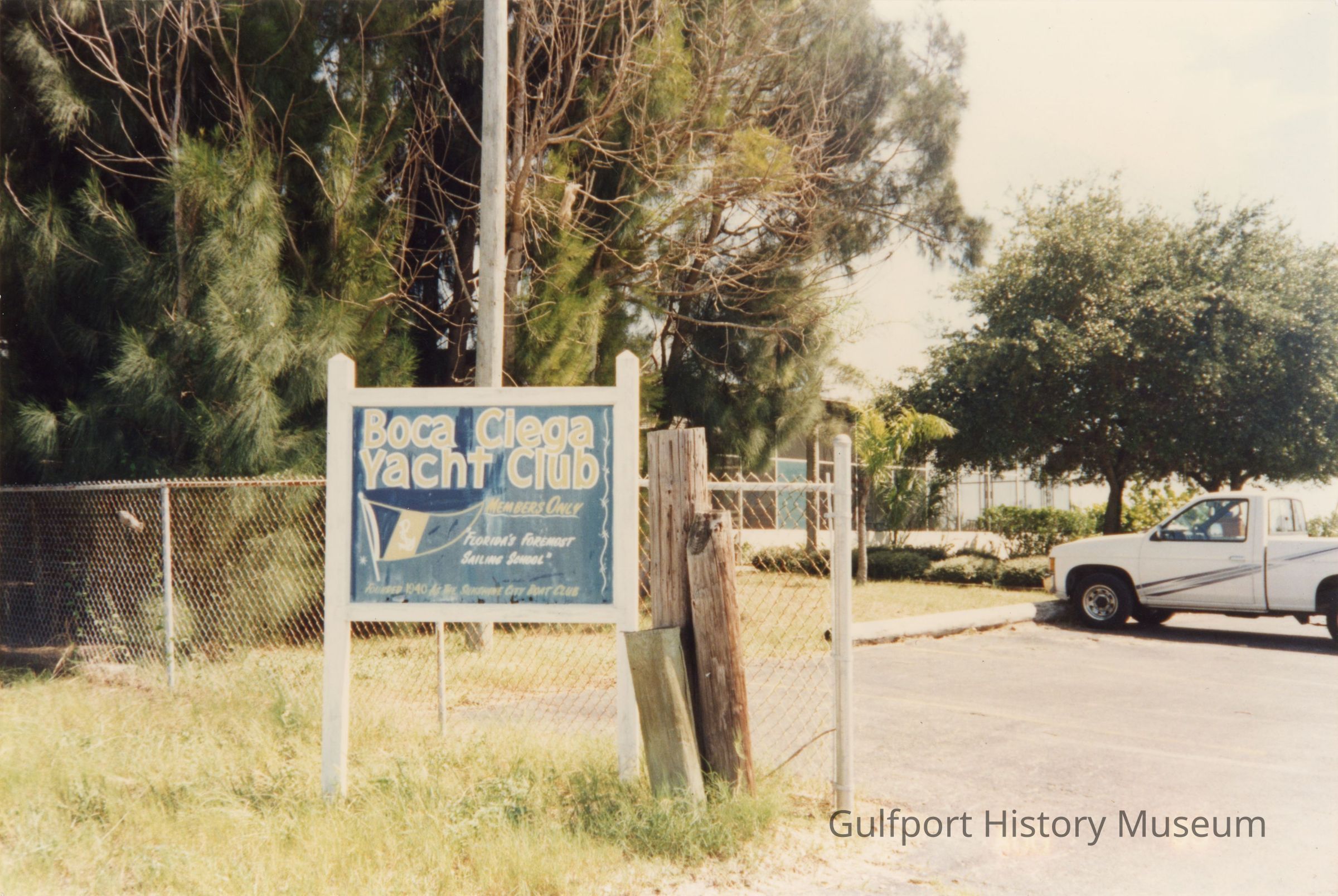 A color photograph of the Boca Ciega Yacht Club sign. The blue and white sign is posted in front of a fenced off parking lot with one parked white truck. The sign reads: