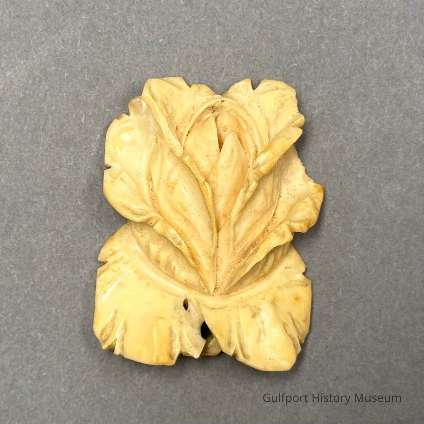 A small carved brooch of a rose. It looks to be modeled after carved ivory, actual material unknown.