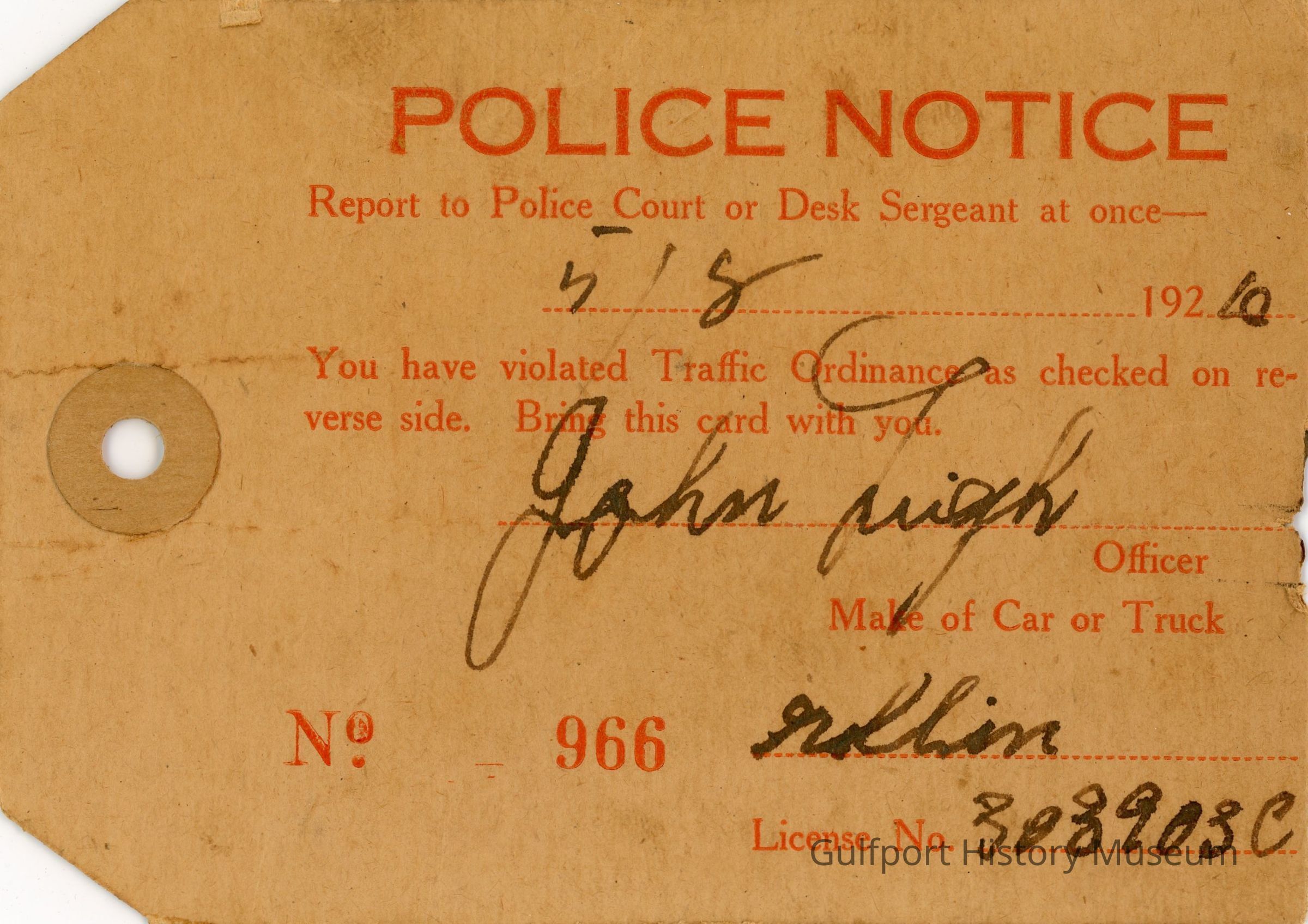 POLICE NOTICE / Report to Police Court or Desk Sergeant at once- / 5/8 1926 / You have violated Traffic Ordinance as checked on re- / verse side. Bring this card with you. / John Leigh / Officer / Make of Car or Truck / Rollin (?) / No. 966 / License No. 303903 CLanguage