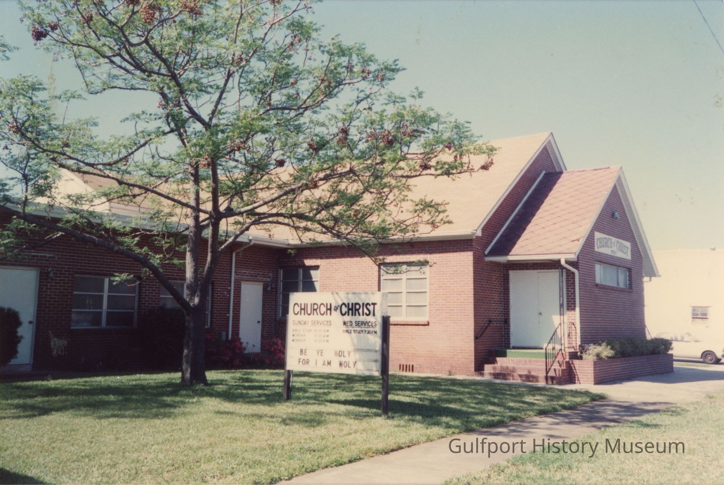 A color photograph of the Church of Christ church building from 49th St, a brick building with several white doors. A tree and a sign are in the surrounding lawn. The sign reads: