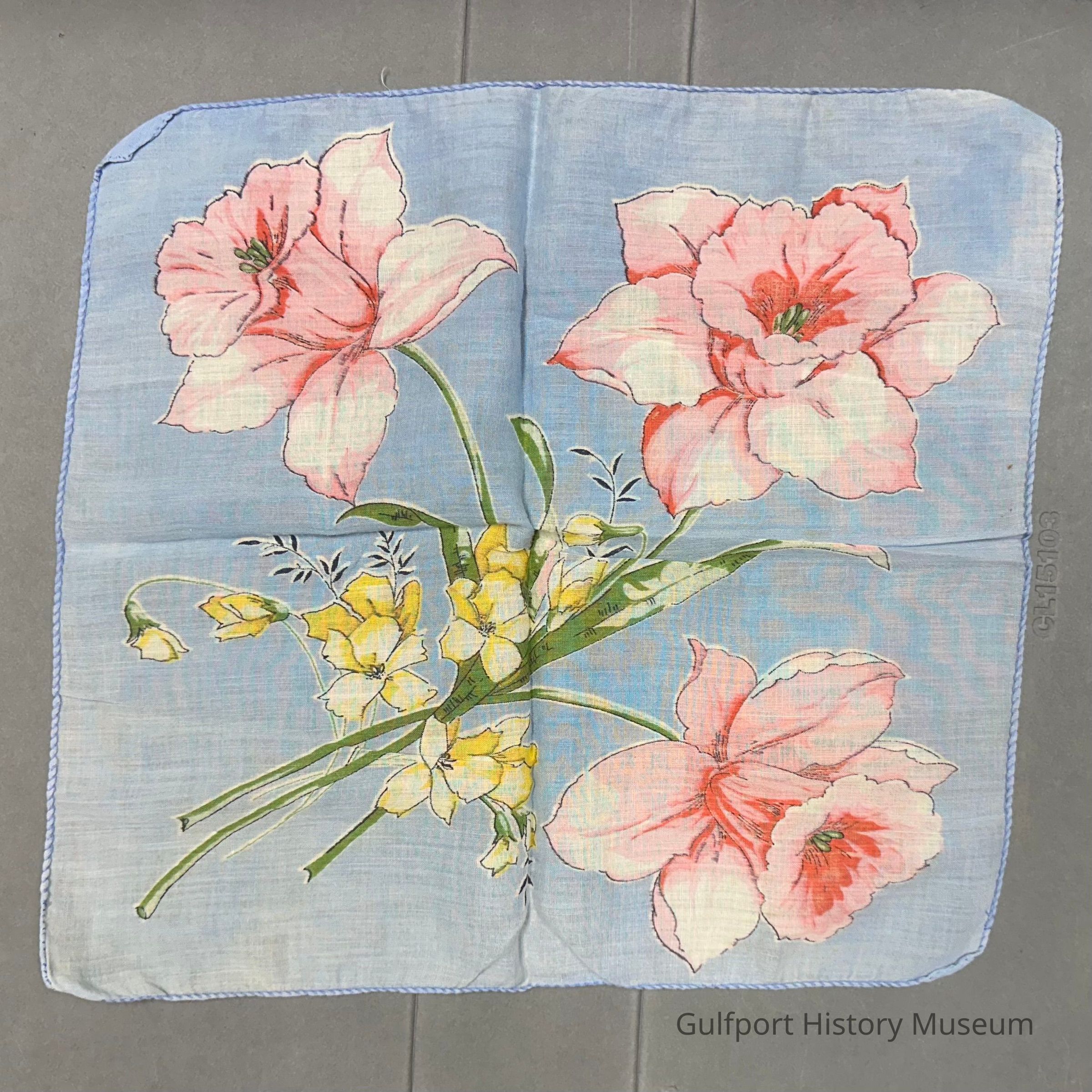 A blue handkerchief with pink and yellow floral design.